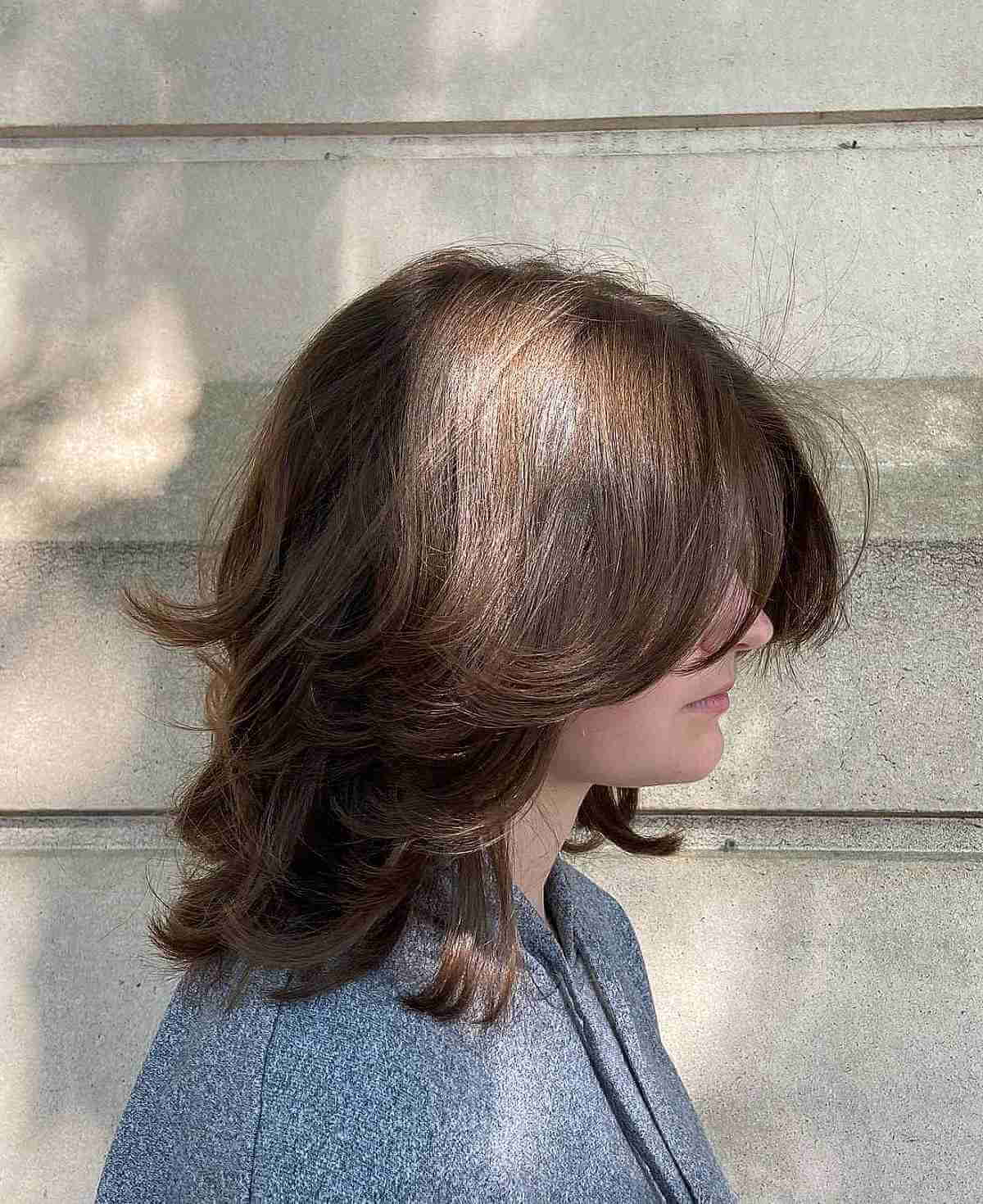 Refresh your look by experimenting with layered bangs alongside your side part. The front layers will echo the popular “butterfly layers.” This delightful style is ideal for the modern woman. Thanks to the layering in the front, you can enjoy effortless days without stressing over styling, as the layers provide the necessary movement for your look.