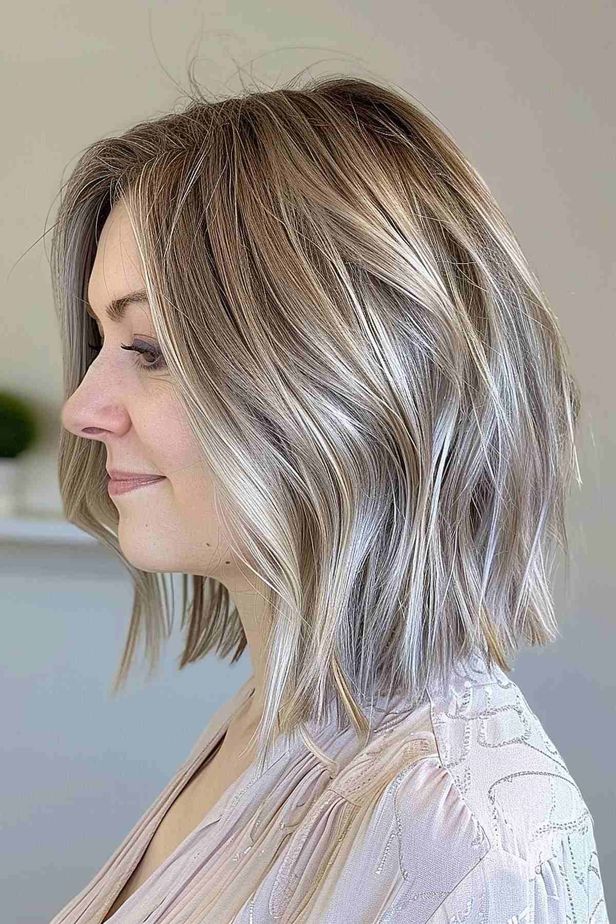 This elegant, shoulder-length bob showcases a mix of soft, gentle layers that enhance movement and depth. The ashy blonde highlights and lowlights create a vibrant, multi-tonal appearance, perfect for those desiring a fresh yet natural look. Suitable for fine to medium hair density, this cut beautifully frames the face, making it adaptable for different face shapes. It’s simple to style with a blow dryer and a round brush for a refined finish, providing you with a contemporary and effortlessly chic appearance.