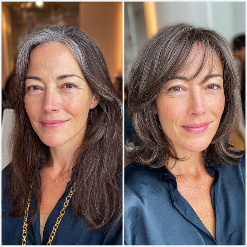This stunning layered asymmetrical cut showcases soft, flowing layers that beautifully frame the face. The hair is medium-length with a slight wave, perfect for adding volume to fine hair. The model’s straight hair type and medium density highlight the cut’s elegance, making it suitable for various face shapes, especially oval and heart. While this style offers a fresh look, it may require some styling time to maintain the layers. The subtle gray tones create a striking contrast and add depth, making it a perfect choice for those wanting a chic, modern update.