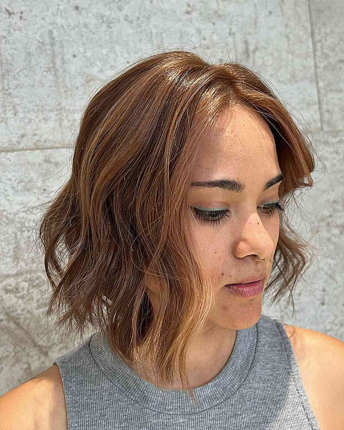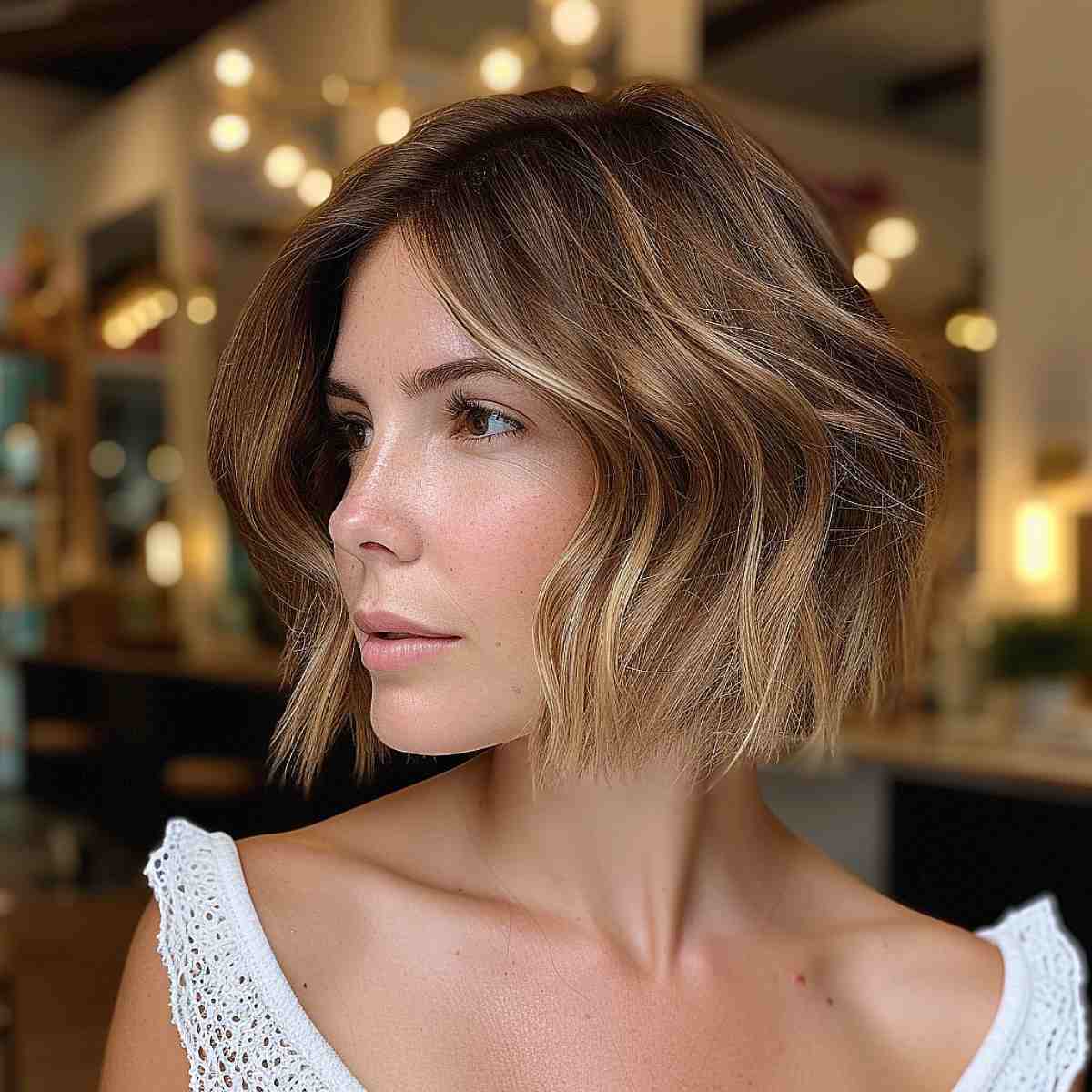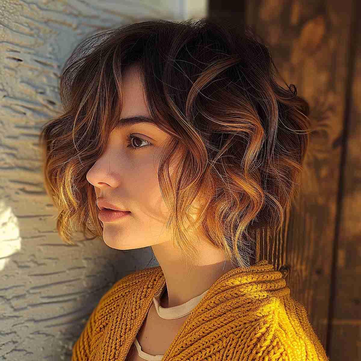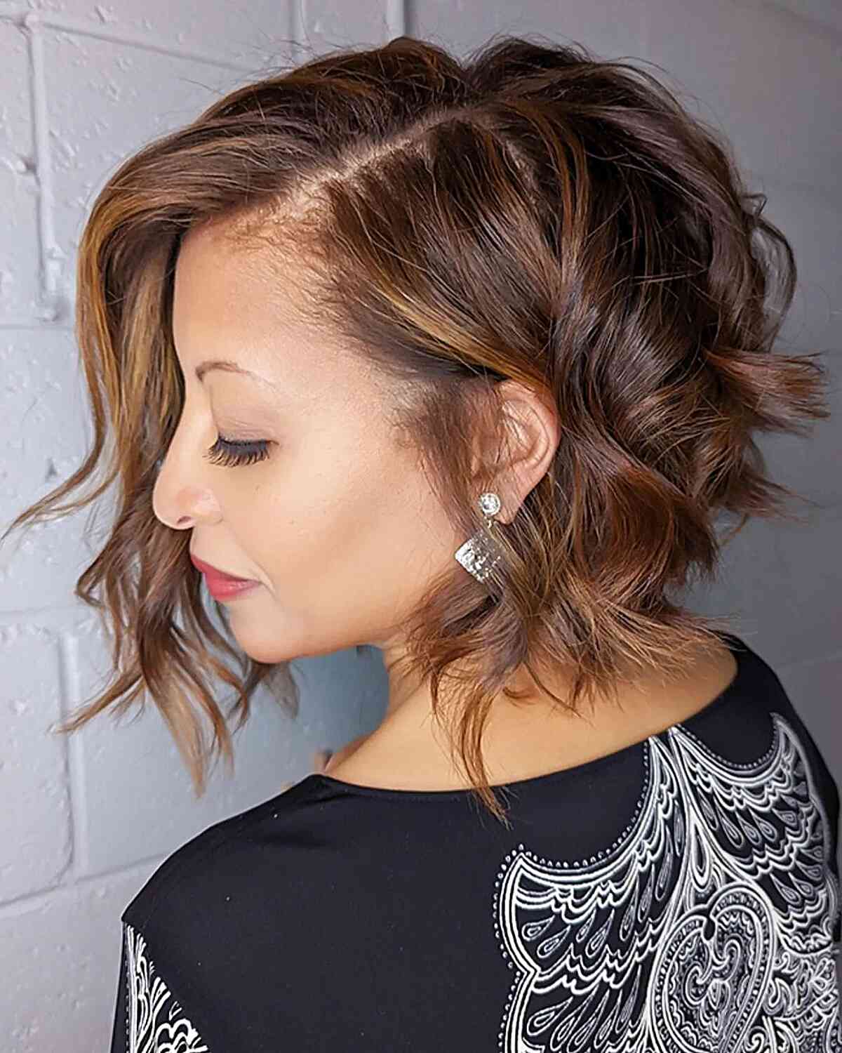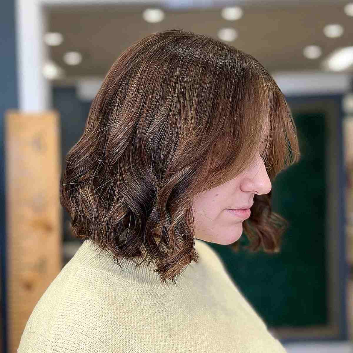 Here’s a stylish wavy bob that brings a youthful charm with caramel highlights creating a delightful blend of color. The waves are soft, adding volume ideal for medium density hair. For those who appreciate dynamic hair without the commitment to intense styling or upkeep, this bob is an excellent choice. While it offers ease of maintenance, keep in mind that waves like these may require a light touch of mousse or spray to maintain their bounce throughout the day. The hues are perfect for someone seeking a warmer palette that’s a subtle step away from natural tones.