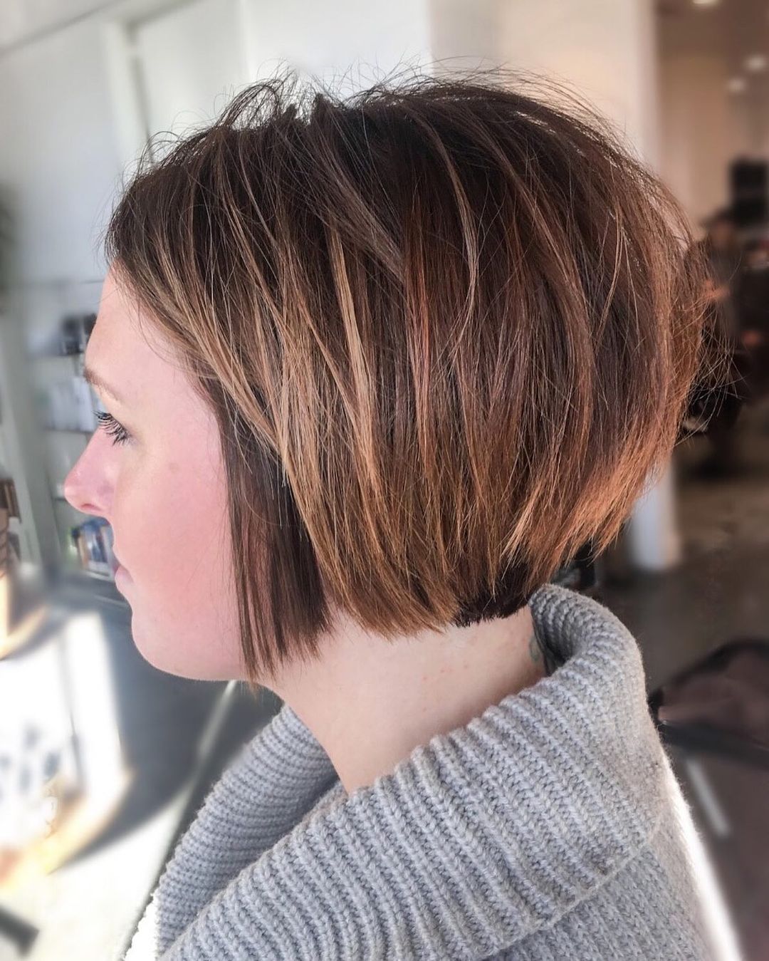 If it’s your first experience with highlights, consider trying a balayage on your shorter hair for a low-maintenance color featuring soft chocolate brown and caramel honey tones. Incorporating the highlights enhances your cut, so choose a short, slight A-line bob with gentle layering for added movement.
