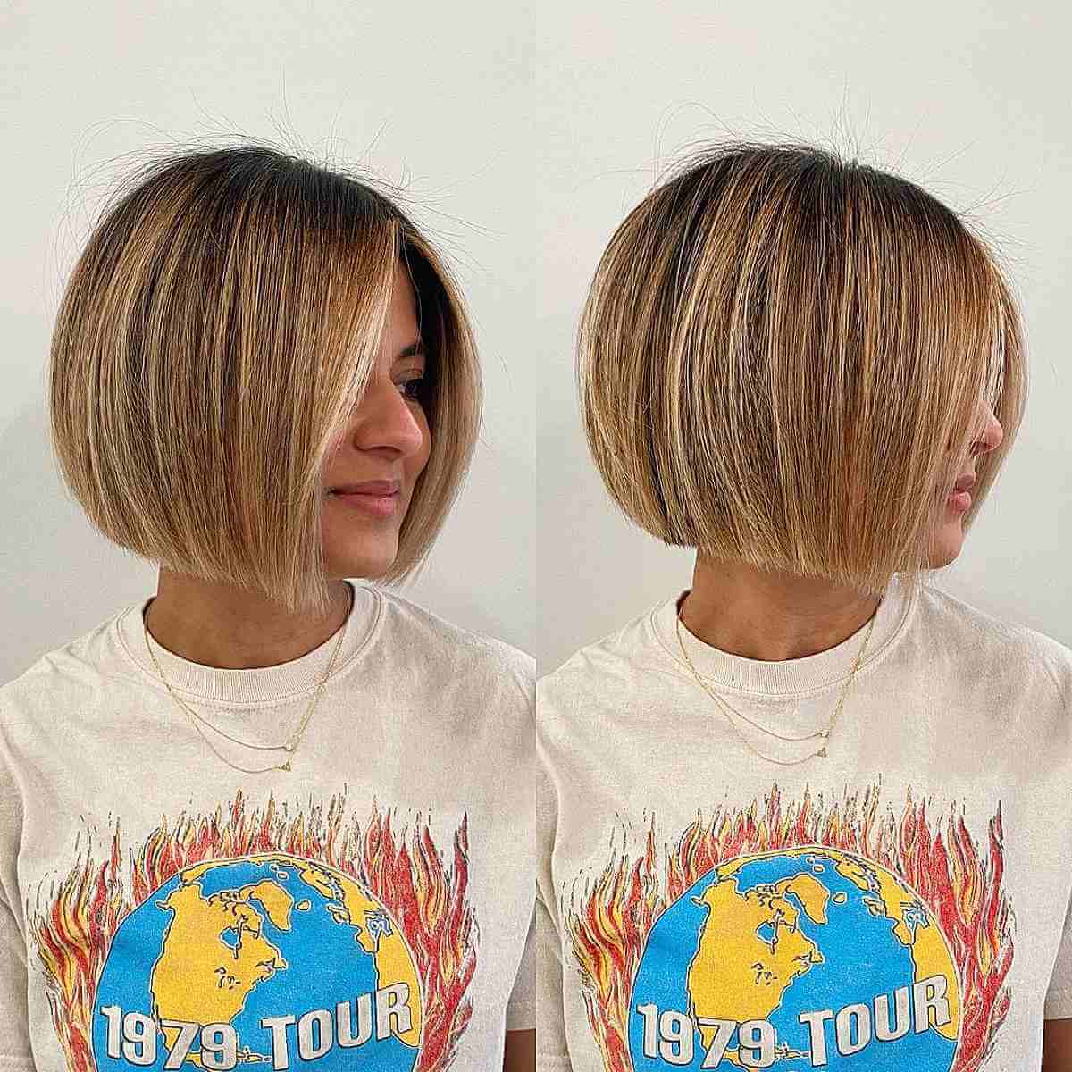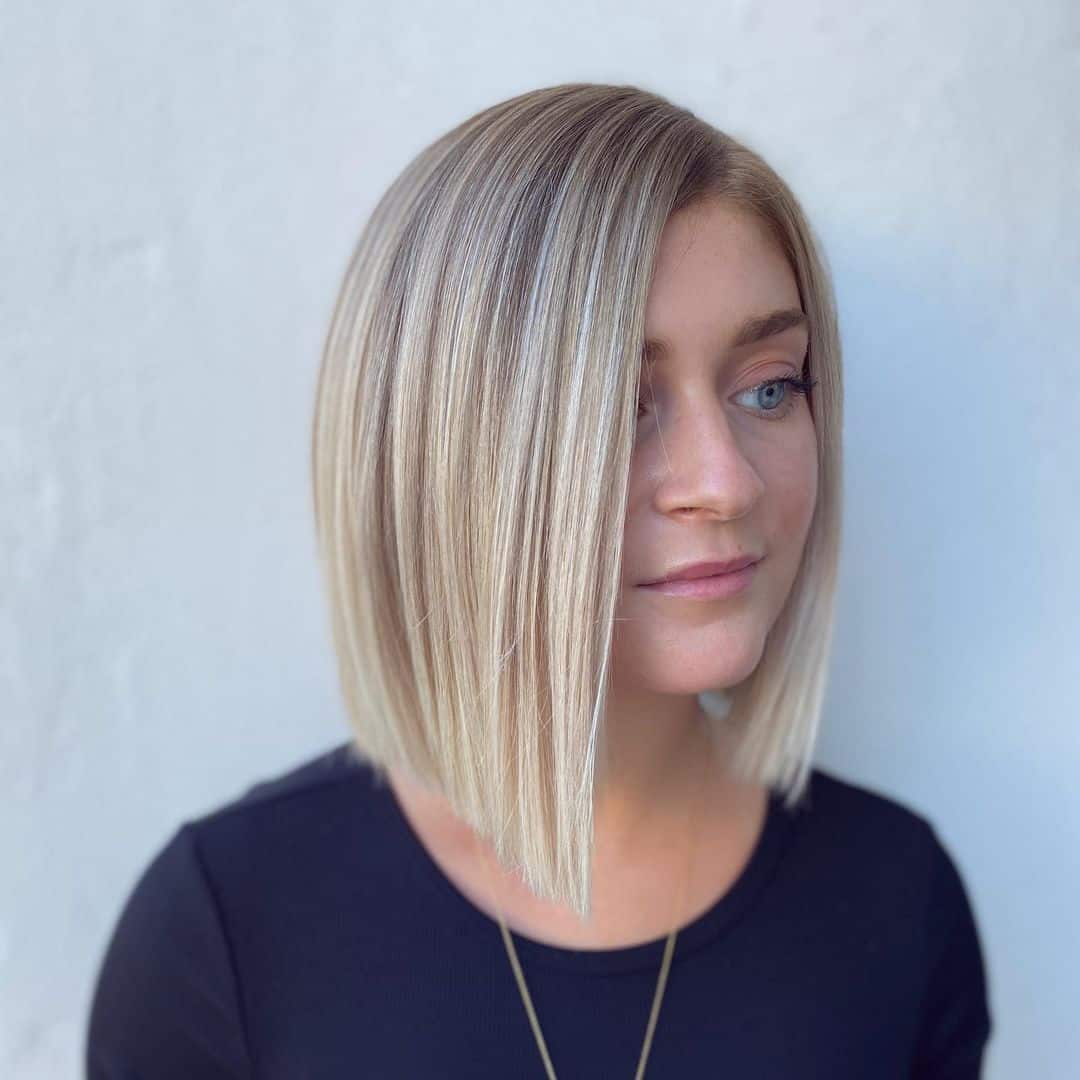 The allure of this bob lies in its elegance and the skilled color blending. Golden blonde and soft brown strands interlace, creating a look that’s both luxurious and dimensional—ideal for enhancing volume in thinner hair. The blunt cut serves as a stylish statement and is remarkably adaptable for various styles. It demands little daily maintenance, but you’ll want to schedule regular trims to keep the sharp, polished edges. Additionally, the color is quite low-maintenance in comparison to full blondes, as the roots can blend out naturally. Just be cautious, if you’re often outdoors, to shield these stunning hues from the sun to avoid discoloration.