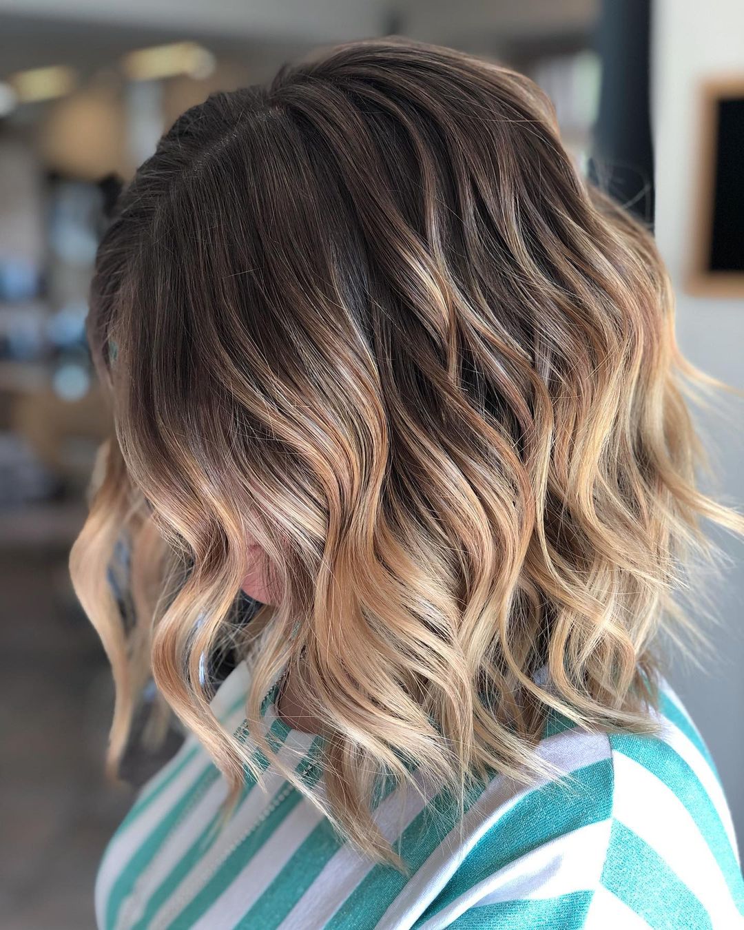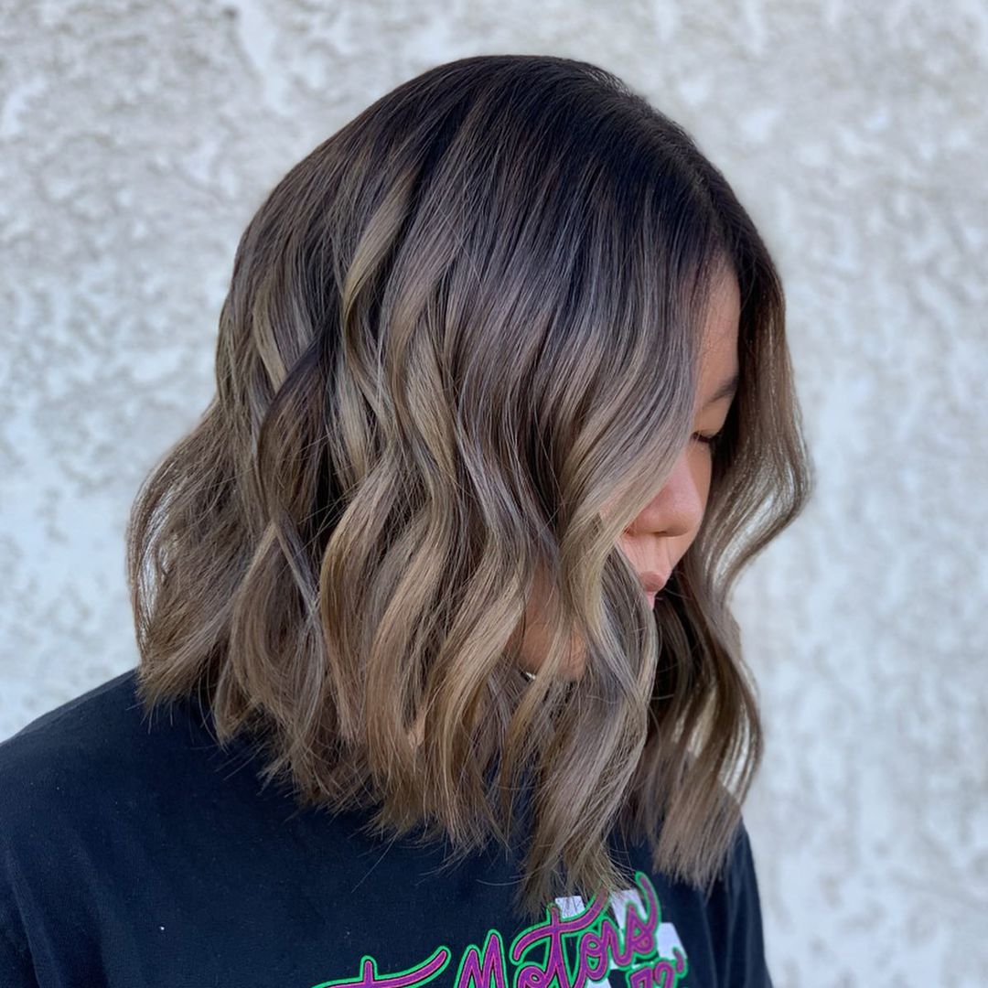 Play with a darker blonde balayage on your chestnut brown hair for a super chic appearance. The darker roots help to carry out warm hues to boost the contrast of tones and the rich color melt effect. The result looks pretty stunning on a shoulder-length haircut. Finishing it off with waves is a great way to achieve a beachy blonde balayage bob style.