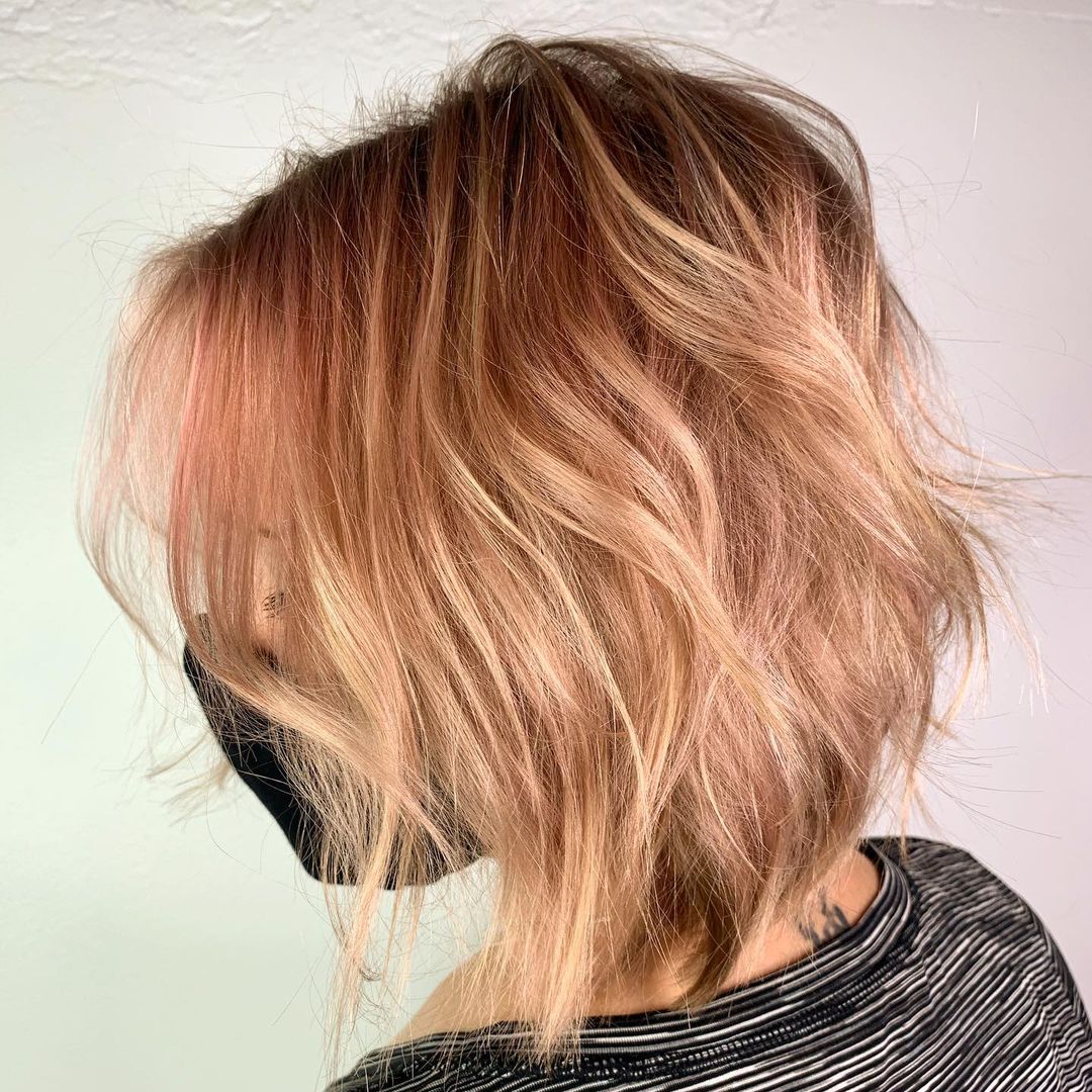 Here comes a rose gold balayage that presents a stylish look. This balayage shaggy hairstyle for short-length hair is ideal for women with natural brown hair color who have fair and light skin tones. If you have fine hair, consider adding a dark or shadow root as they enhance fullness.