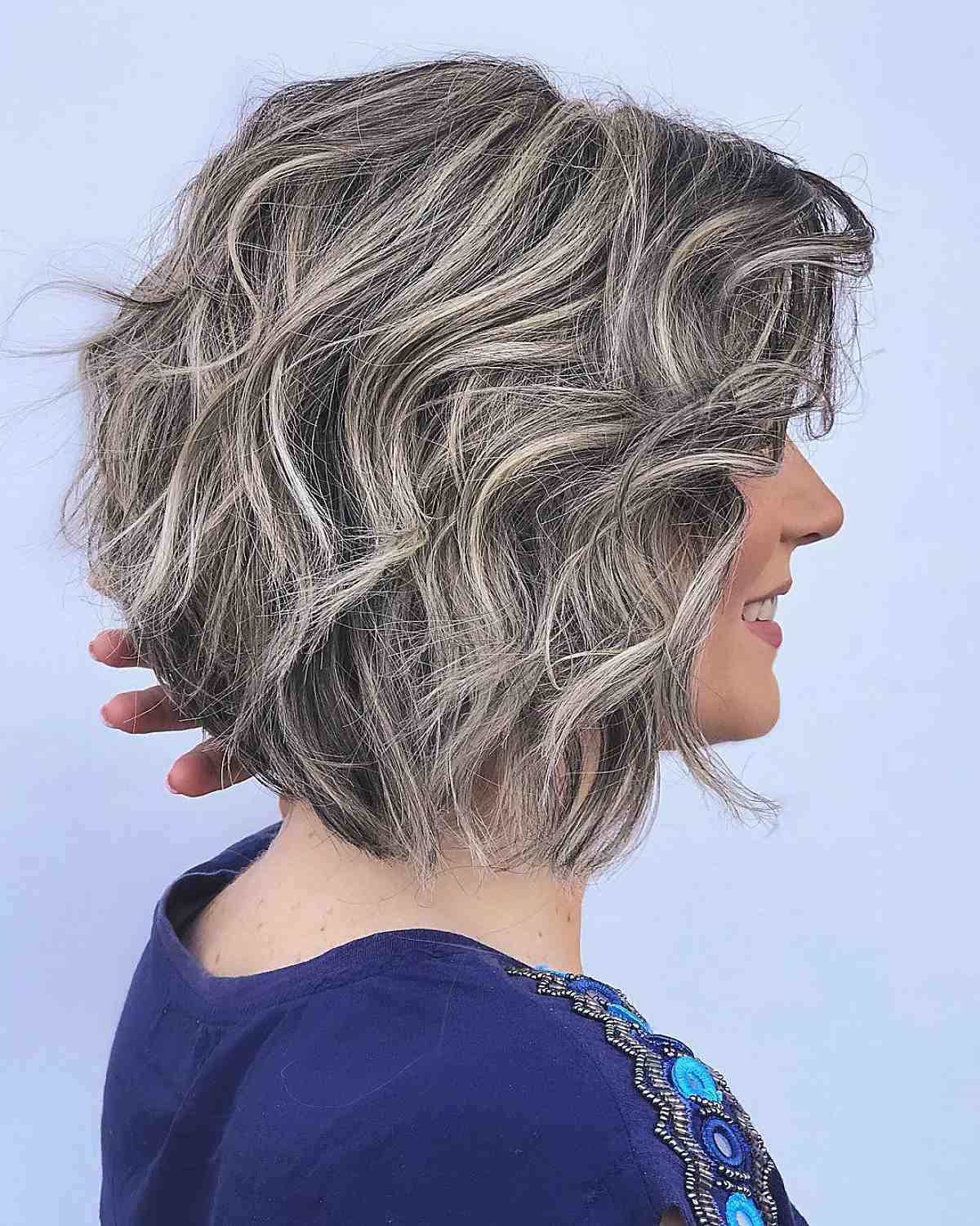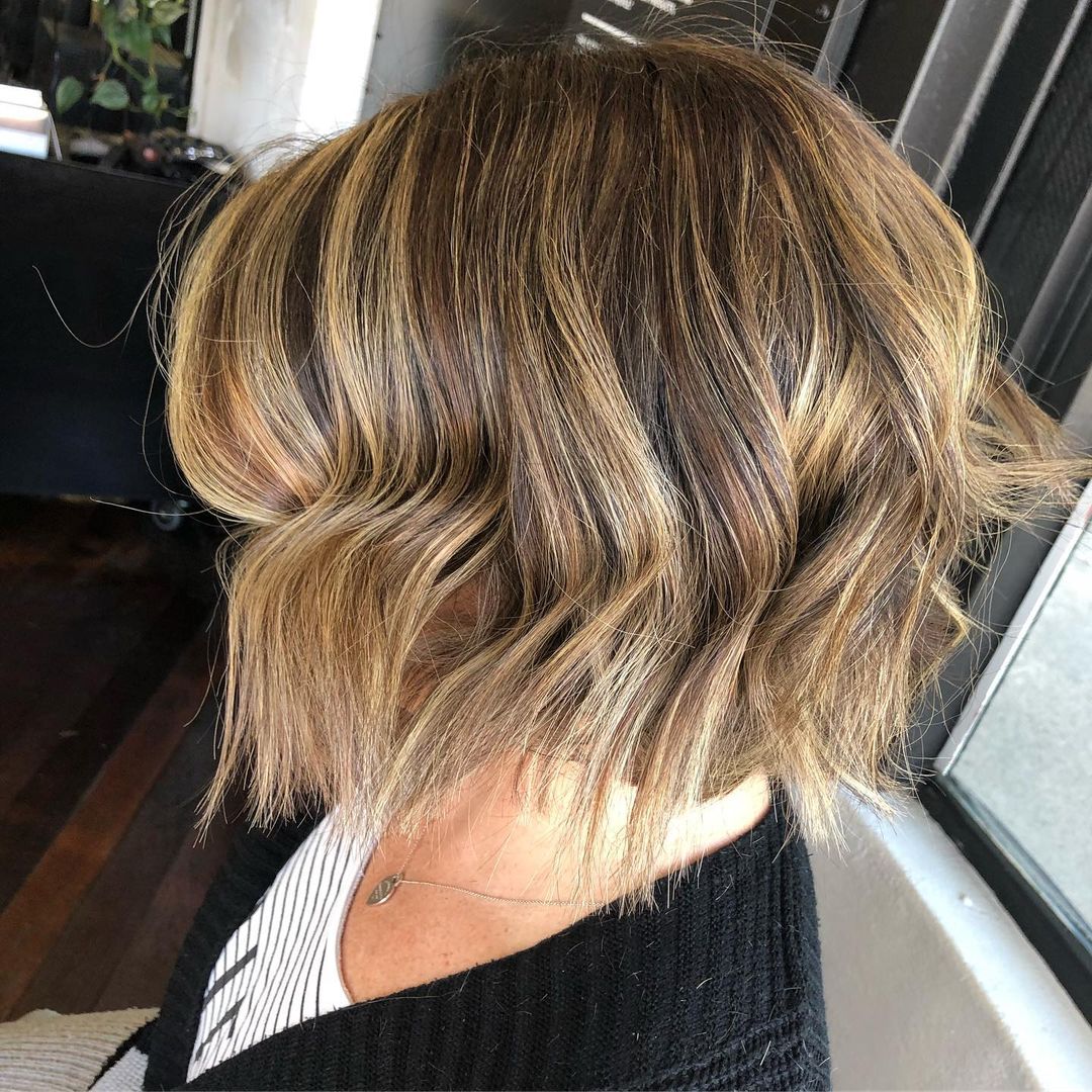 Consider trying a concave choppy bob with a beautifully blended caramel blonde balayage color. Keep your front strands lighter to brighten up your face. The cut and the caramel balayage color are great for the low-maintenance woman! Concave bobs with choppy layers on curly hair can also look stunning.