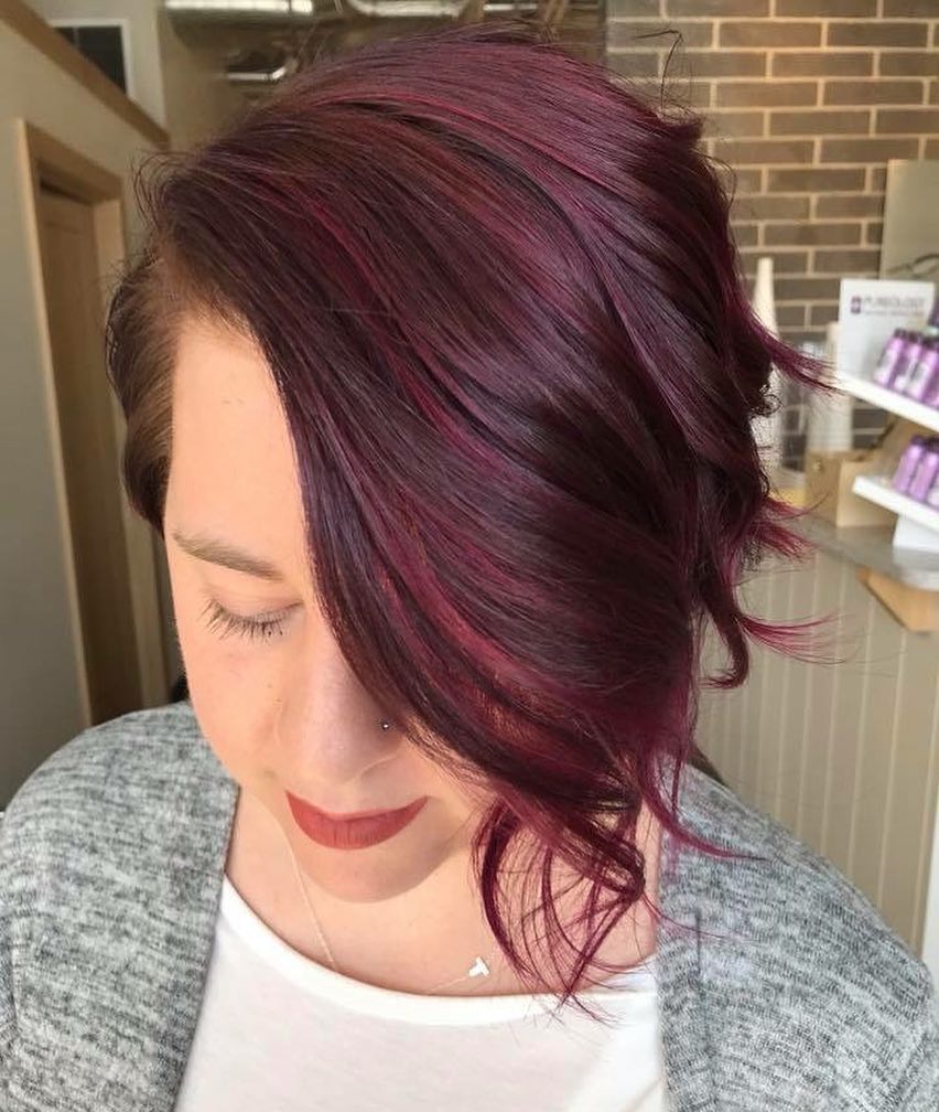 The red balayage accents on this adorable maroon asymmetrical bob create a rich raspberry tone and a playful look. It’s perfect for women who always want funky and unique hair colors while keeping a polished work appearance. This balayage short hair color is a showstopper for shine and pushing the edge just enough to feel comfortably daring.