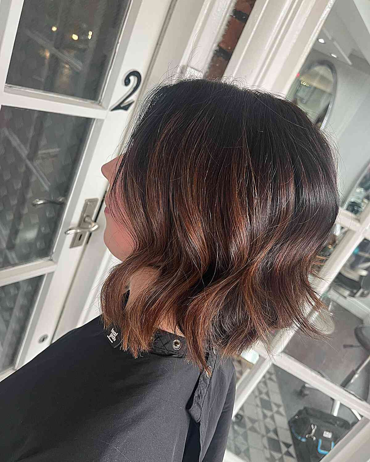 A beautifully blended auburn/copper balayage with short hair is just what you need for this time of year. If you lean towards a more lively effect, hints of an amber tone will work perfectly. This hair color for short hair appears stunning on light waves!