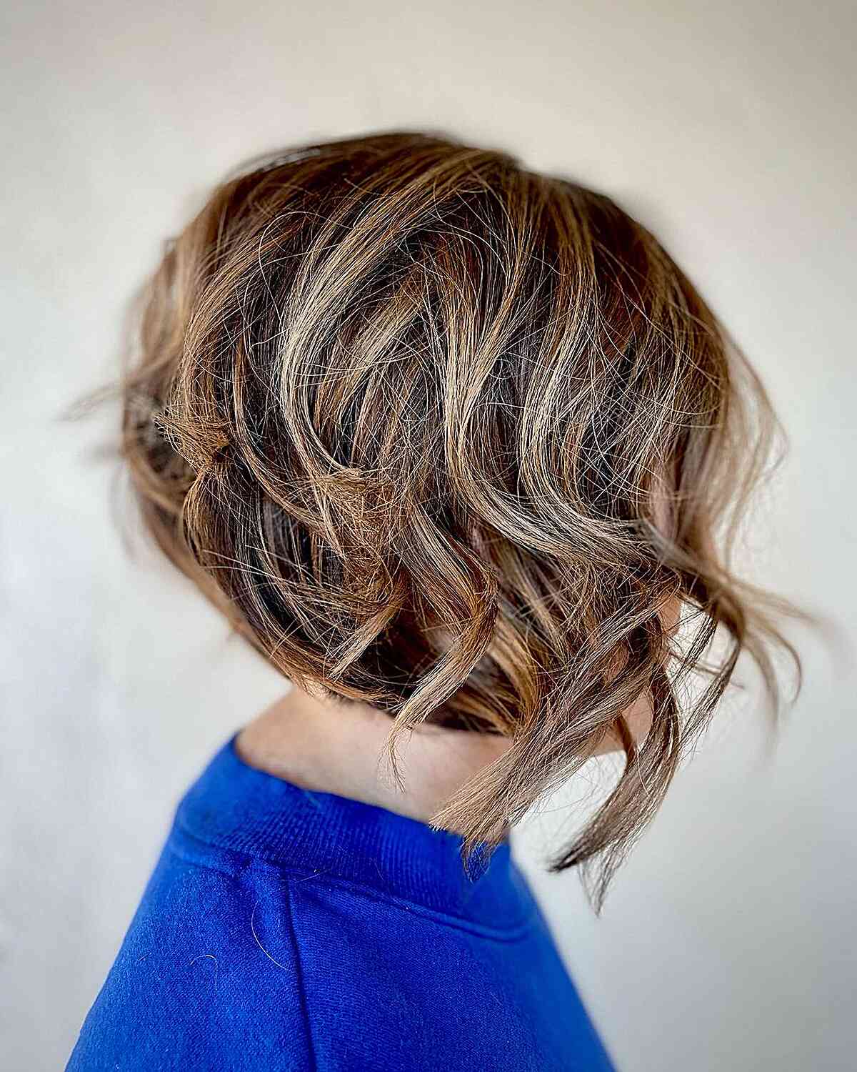 This tousled bob is a fun take on the classic, with curls that bring energy and fullness. The skillful mix of highlights and lowlights creates a caramel swirl effect that’s simply charming on medium to thick hair, offering the appearance of even more volume. While the style appears effortless, it will call for a good curl defining cream and possibly a light spritz to maintain the bounce. Perfect for a touch of fun, it’s a look that’s both relaxed and stylish, great for those who enjoy a bit of morning styling routine to keep those gorgeous curls in check.