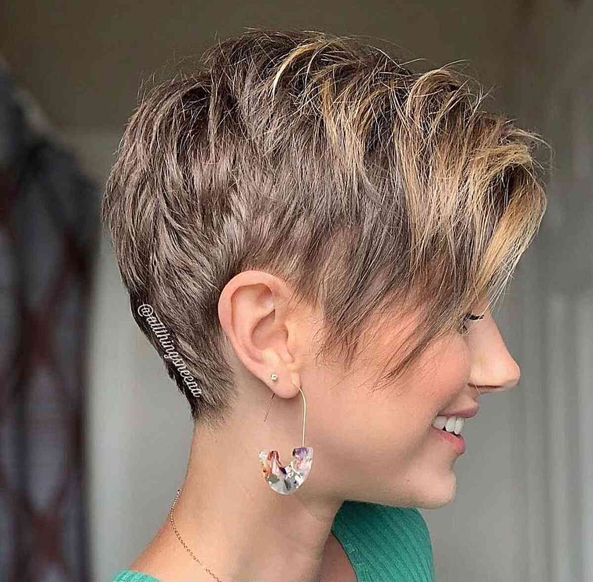 A long pixie with mocha balayage accents offers an exciting and low-maintenance look. Most of the time, this pixie would only require texture when styling. For a piece-y definition, use a texturizing spray. You can pull off this short haircut balayage the best if you have a pale skin tone.