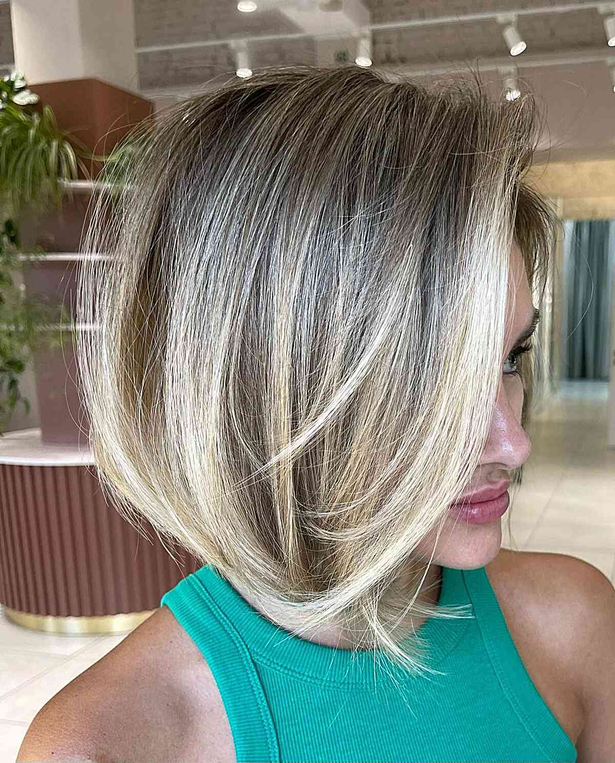 Chin-length bronde balayage highlights featuring a dark root are a stylish complement to your short hairstyle. It’s perfect for those looking to experiment with a new hair color for the first time. A balayage technique is an excellent way to achieve a lighter look without compromising the health of your hair. Achieve the best results by pairing it with beachy waves.