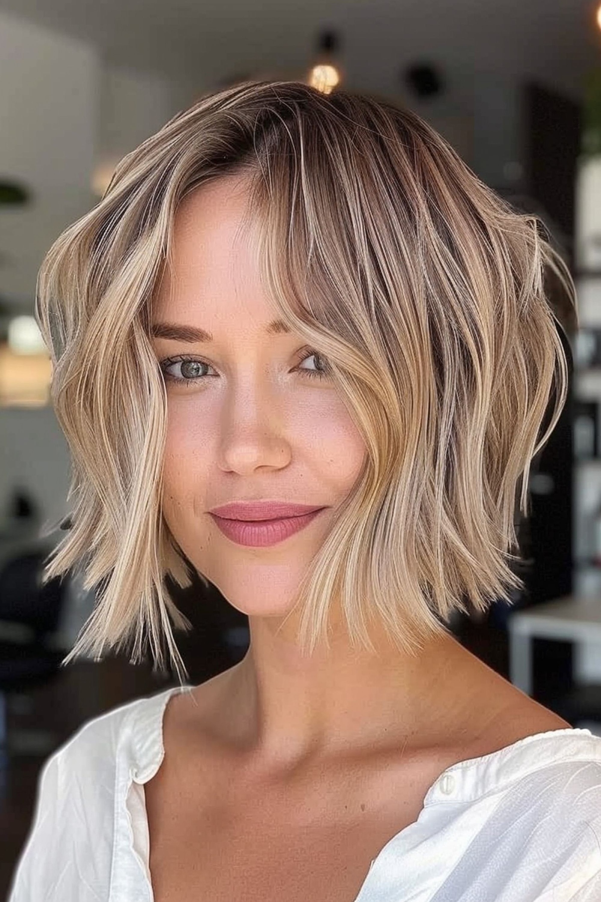 A choppy bob with balayage offers a striking yet gentle appearance. The juxtaposition of the bob’s straight lines with the fluidity of balayage creates a stunning harmony that many women adore. When choosing this hairstyle, be ready to arrange a few upkeep appointments to maintain its fresh look.