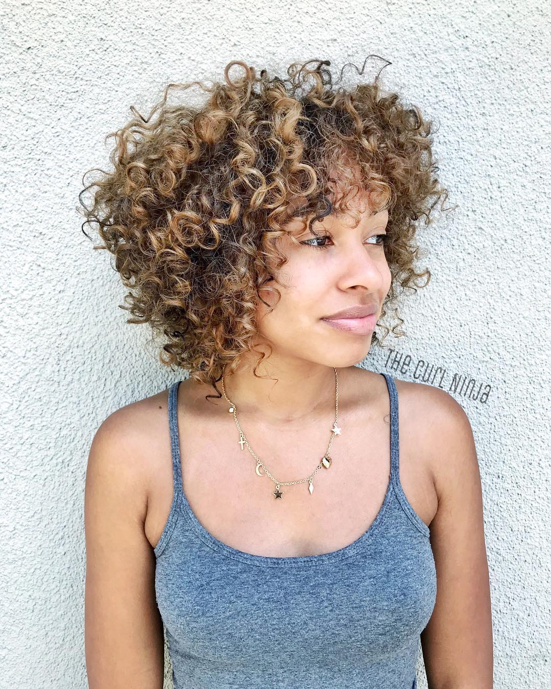 This ‘do features an entire head of warm, sun-kissed dimensional painted highlights and a stacked curly bob with bangs. If you desire this short balayaged style, schedule a complete balayage highlight and curl cut. Seek out a stylist who specializes in balayage for short hair, as it’s softer on your locks compared to foil highlights. It doesn’t transfer heat in the same way foil does, which can lead to overprocessing and harm your curls. The outcome is a dimensional balayage highlight incorporating various tones in a single treatment.