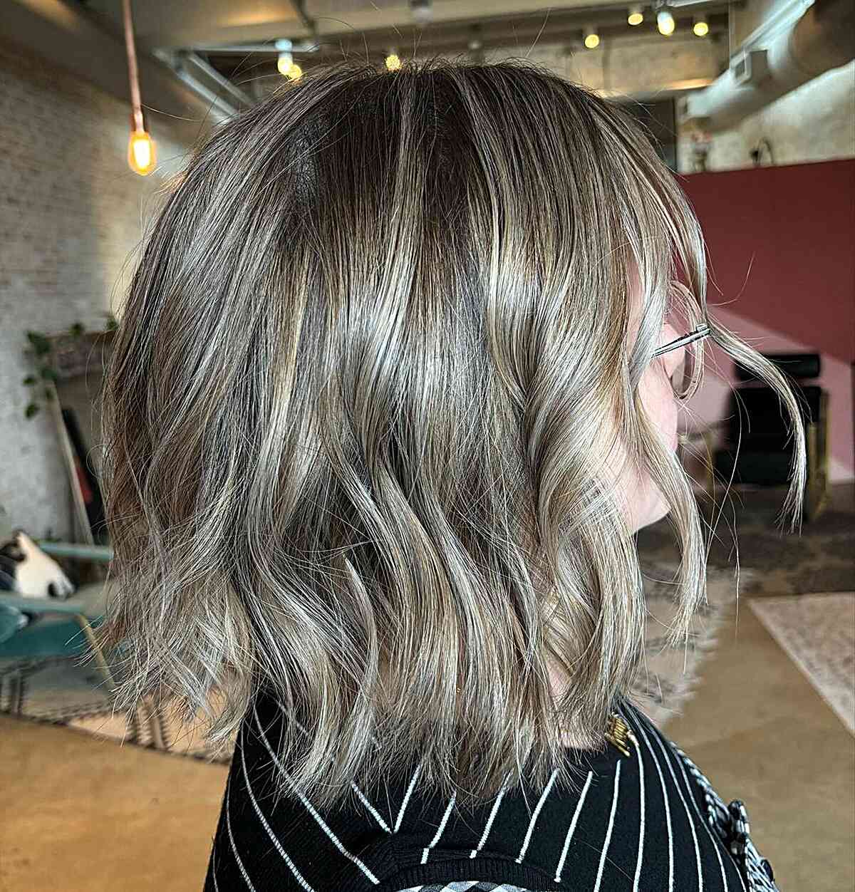 This mid-length lob is a fantasy for anyone seeking that effortless, beachy appearance with a hint of sophistication. The layered cut provides a lightweight sensation—ideal for medium to thick hair—and the waves add movement and bounce, perfect for highlighting the balayage tones. The color is skillfully crafted, with darker roots transitioning into a lighter, sun-kissed hue, which allows for less noticeable regrowth and more time between touch-ups. While this style exudes a relaxed vibe, keeping up with the color and waves may demand some attention, including the use of a color-protective shampoo and a quality sea salt spray or curl enhancer to maintain those crisp waves.