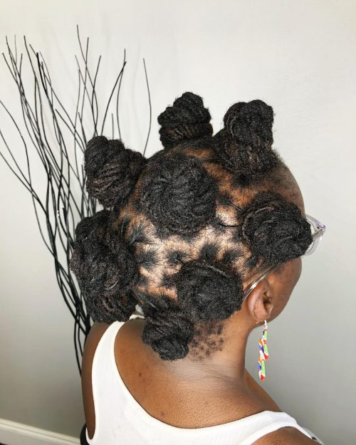 These beautiful Bantu knots on dreadlocked hair are guaranteed to give your roots a captivating and distinctive pattern. Just keep your favorite moisturizing product handy to create your Bantu buns. Remember to use a bobby pin for each bun to ensure extra security, too.