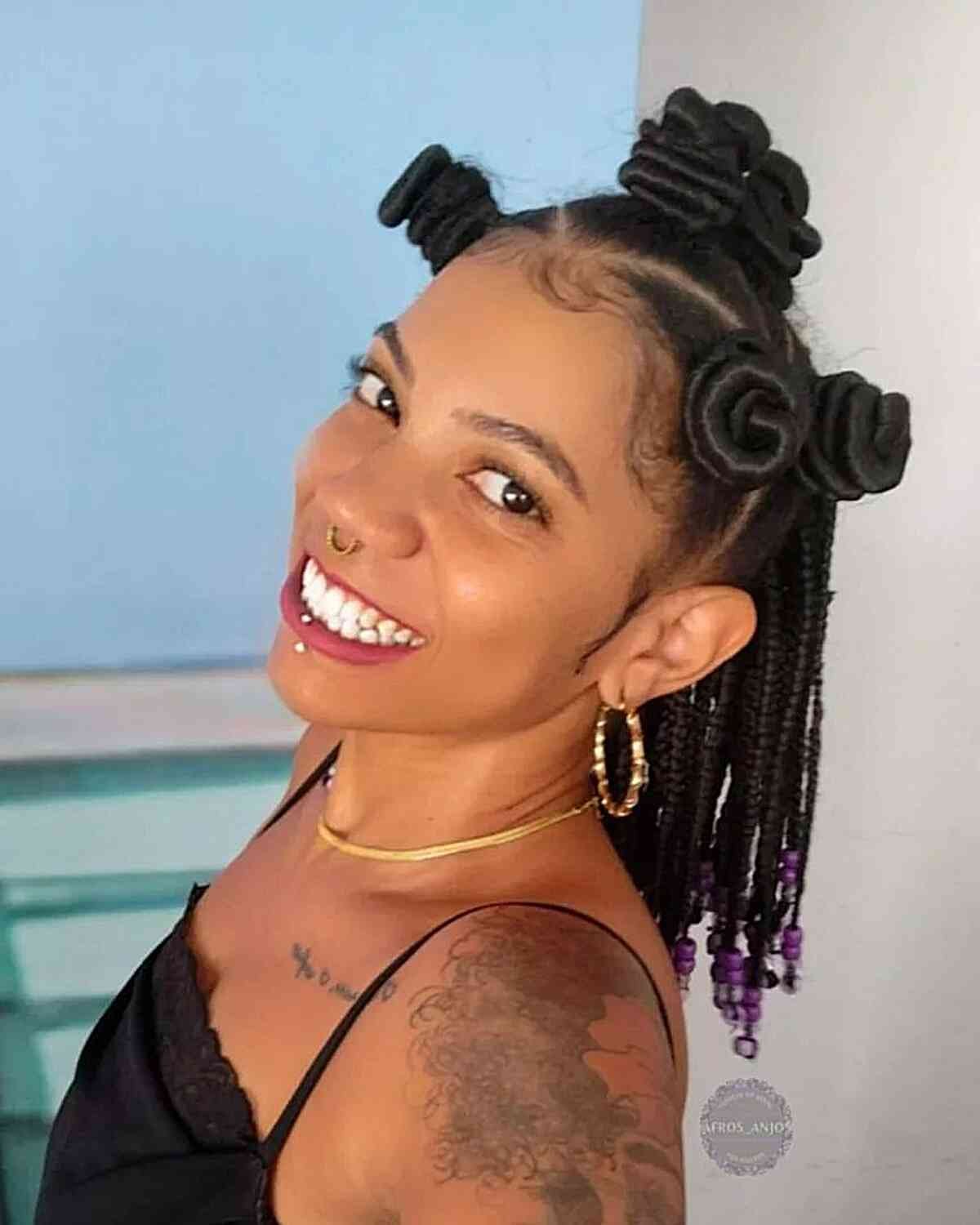 Bantu knots combined with braids is an innovative hairstyle that looks best on a woman who exudes confidence. Stylist Elle Bee of Atlanta, GA shares that it doesn’t require much time to create yet is truly unique and stylish.