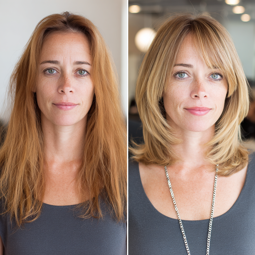 This radiant layered cut is perfect for adding movement and dimension to your hair. The face-framing bangs soften the look and beautifully highlight your features. With medium-length hair, this style is versatile for various face shapes. The model’s fine hair density allows the layers to create a fuller appearance, while the subtle balayage adds depth. One consideration is maintenance; regular trims are key to keeping the layers looking fresh. This style is especially flattering for those who want a youthful and vibrant look.