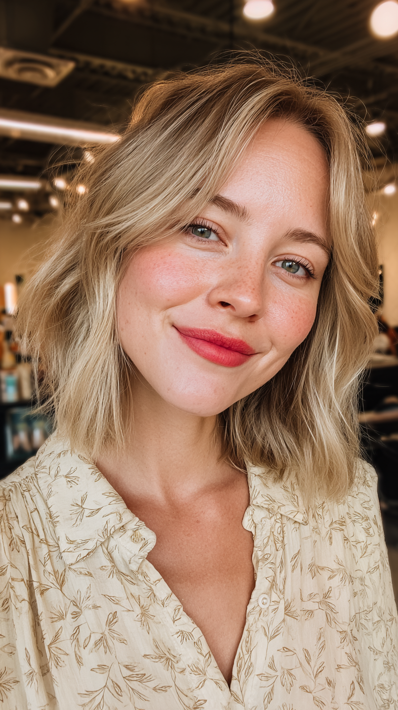 This cut features soft, beachy layers that enhance movement and texture, perfect for fine to medium hair types. The shoulder-length cut is flattering for oval or heart-shaped faces, and the subtle highlights add dimension without overwhelming the look. A benefit of this style is its low maintenance; a quick tousle with some sea salt spray can give you that effortless finish. However, if you’re looking for something more dramatic, this might feel too subtle. The unique feature is the slight face-framing layers that soften the overall appearance.