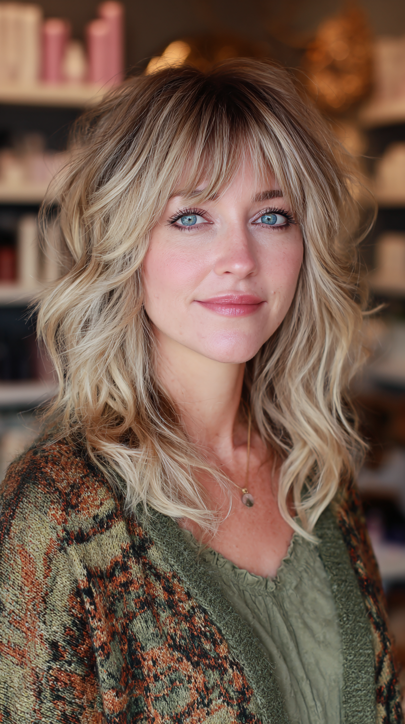 This look features shoulder-length, layered blonde hair with soft, face-framing bangs that add movement and dimension. The texture is perfect for fine hair, providing volume without overwhelming the face. The model’s natural waves enhance the playful yet polished feel. While this style is versatile and can be easily maintained, it may require regular trims to keep the bangs looking fresh. If you have an oval face shape, this cut beautifully highlights your features while giving a youthful appearance.