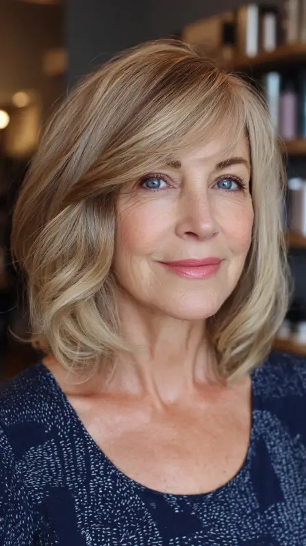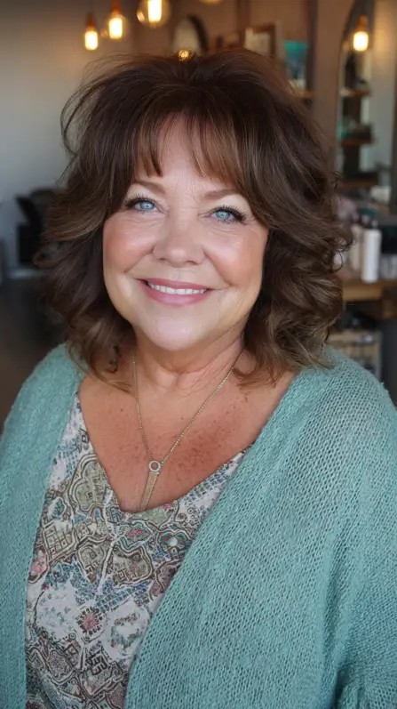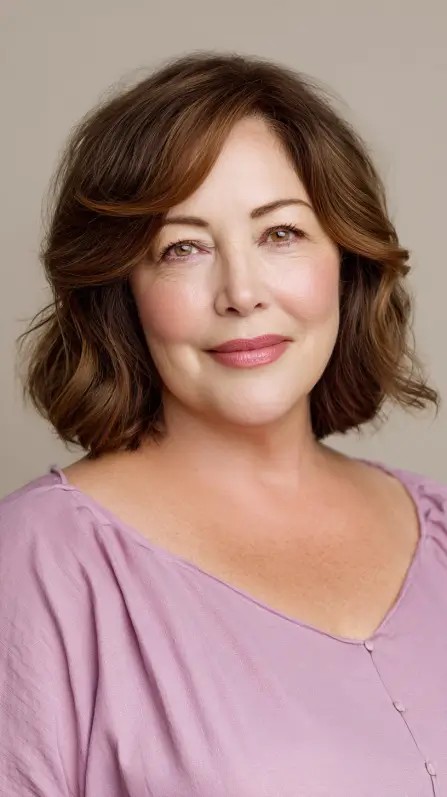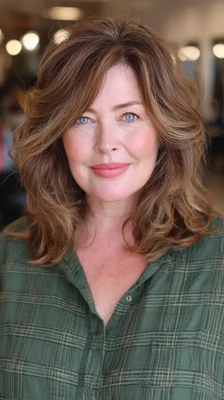 This look features soft layers that cascade beautifully, adding movement and volume to medium-length hair. The subtle highlights enhance the texture, making it a great choice for women over 50 looking to refresh their style. This cut works best for medium to thick hair types and suits various face shapes, providing a soft frame. However, keep in mind that while layers can add volume, they may require more styling time to maintain that bouncy look, especially with wavy textures.