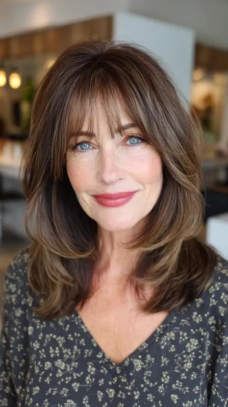 This layered face-framing cut with soft bangs beautifully enhances your facial features while adding volume and movement to mid-length hair. Perfect for fine to medium hair types, this style works wonders for those with oval or heart-shaped faces. The soft layers create a youthful look, while the bangs soften the forehead. Keep in mind, maintaining this cut may require regular styling to keep the bangs in place. The light brown tones with subtle highlights add depth, making it a vibrant choice for women over 50.