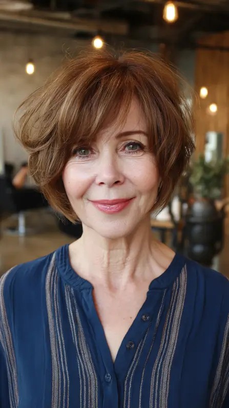 This voluminous textured bob is perfect for adding life to fine hair, especially for women over 50. The soft bangs frame the face beautifully, making it ideal for oval or heart-shaped faces. The layered cut provides movement and fullness, which helps to create the illusion of thicker hair. However, if your hair is too coarse, this style may require more maintenance. A unique touch here is the slight inward curl at the ends, enhancing the softness while keeping it modern and chic.