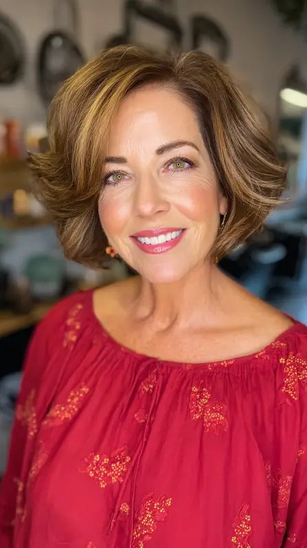 This soft layered bob is perfect for adding movement and texture to fine hair, especially for women over 50. The layers start just below the chin, creating a flattering frame for the face, ideal for oval or heart shapes. The subtle highlights enhance dimension while keeping maintenance low. However, this style requires regular trims to maintain shape. It’s also great for those seeking a youthful, fresh look without heavy styling—just a quick blowout and you’re ready to go!