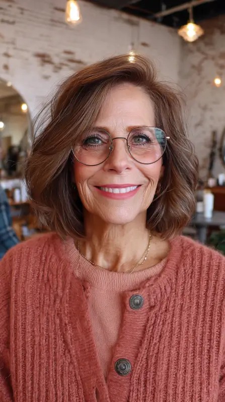 This softly layered cut beautifully enhances natural waves, making it ideal for women over 50. The face-framing layers add volume and movement, perfect for softening angular features. If you have medium to thick hair, this style works wonders, as the layers help reduce weight while still providing fullness. However, fine hair may need additional styling products to achieve the same effect. The rich, warm tones in the hair provide a youthful glow, making this a great option for those looking to refresh their look without a drastic change.