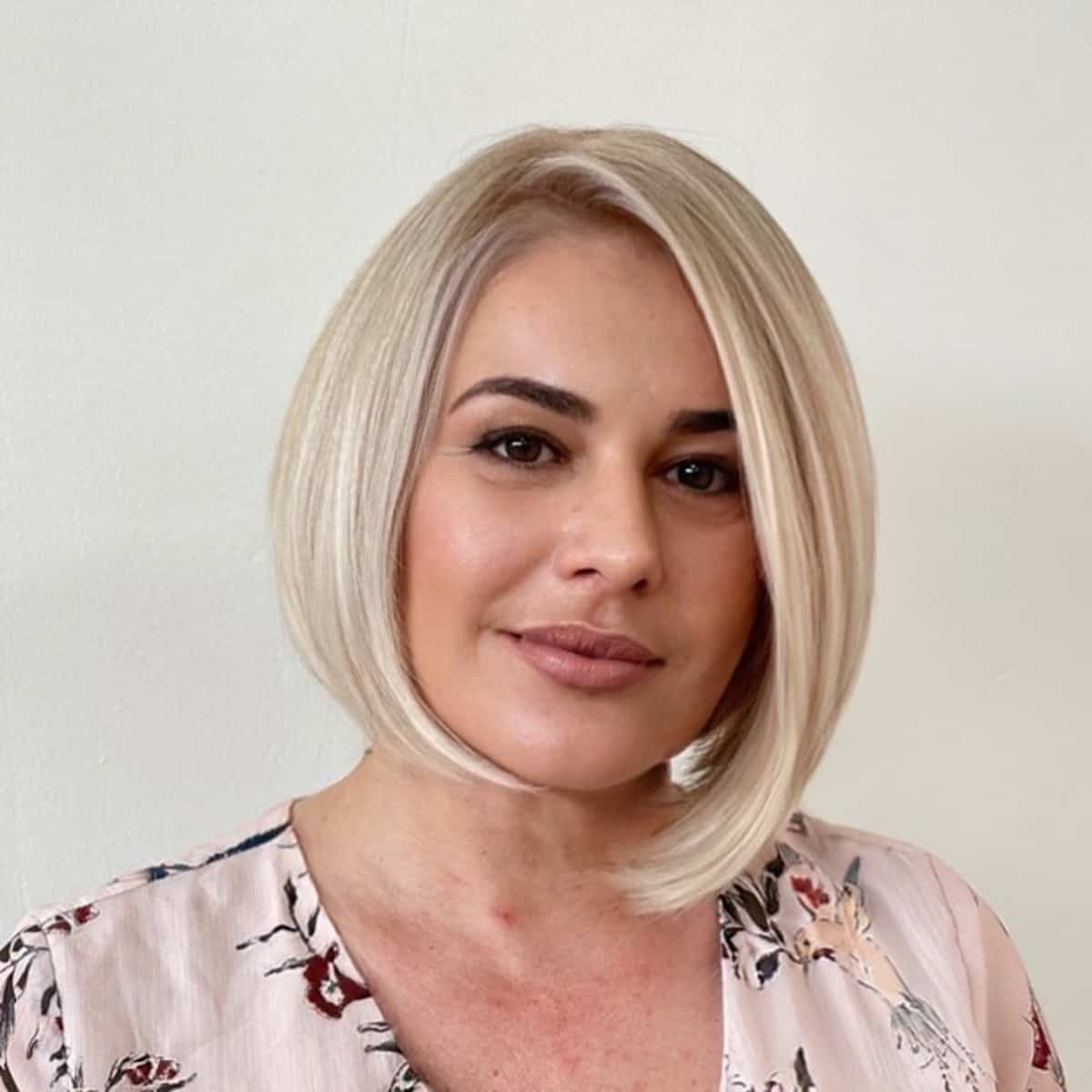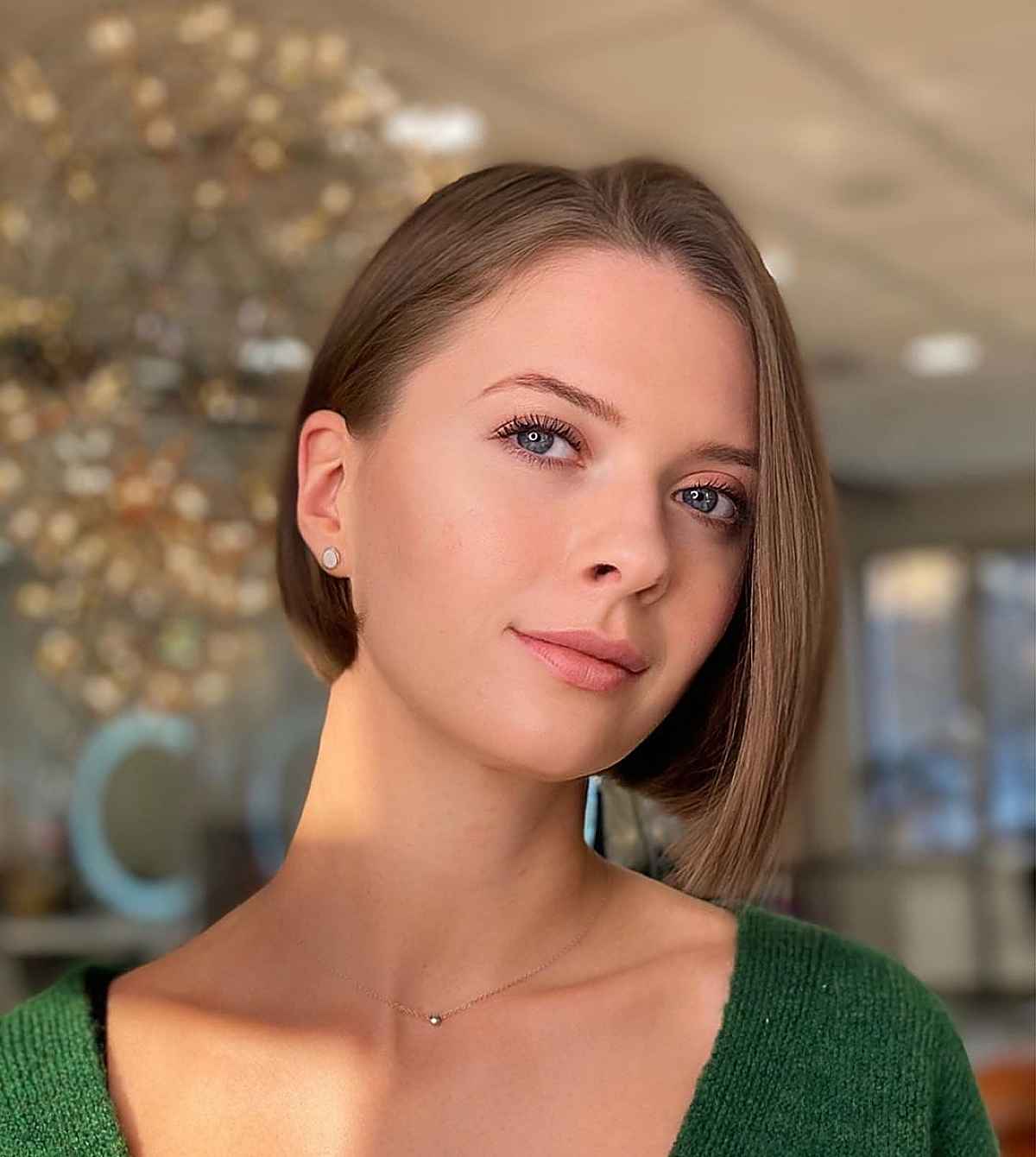 This beautiful sandy blonde bob showcases a stylish, edgy design with its precise neck-length cut. Those with straight hair can effortlessly carry this sleek look, emphasizing its sharp silhouette. When discussing with your stylist, highlight the importance of the angle to complement your profile. Achieve a salon-fresh finish daily with a flat iron and a shine-boosting spray.