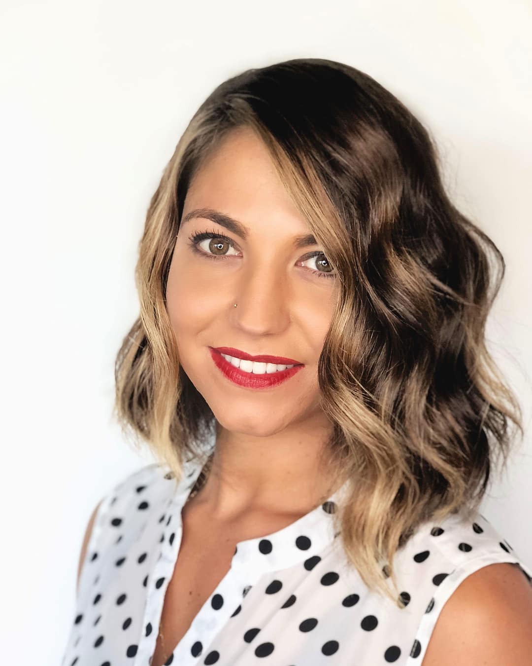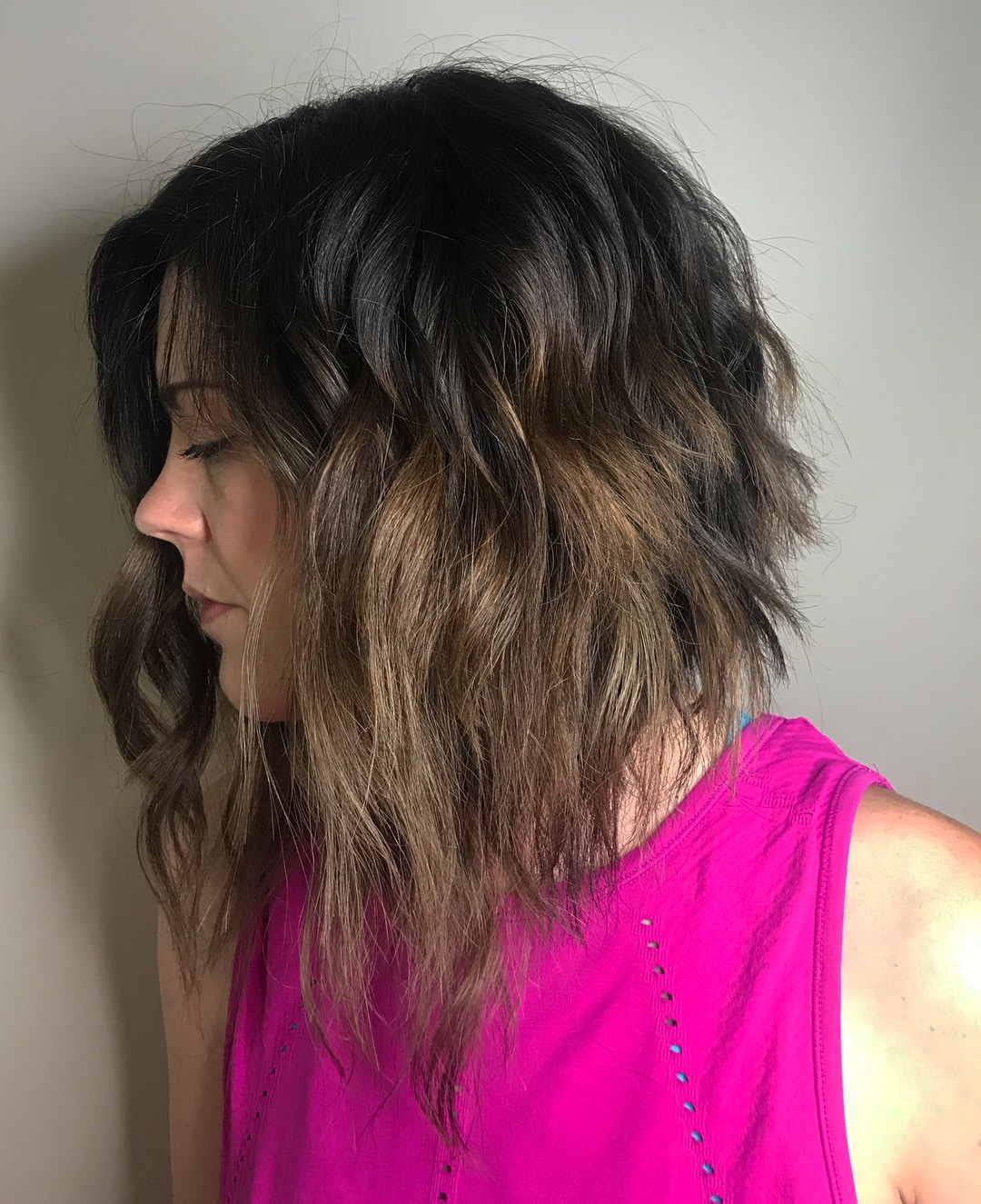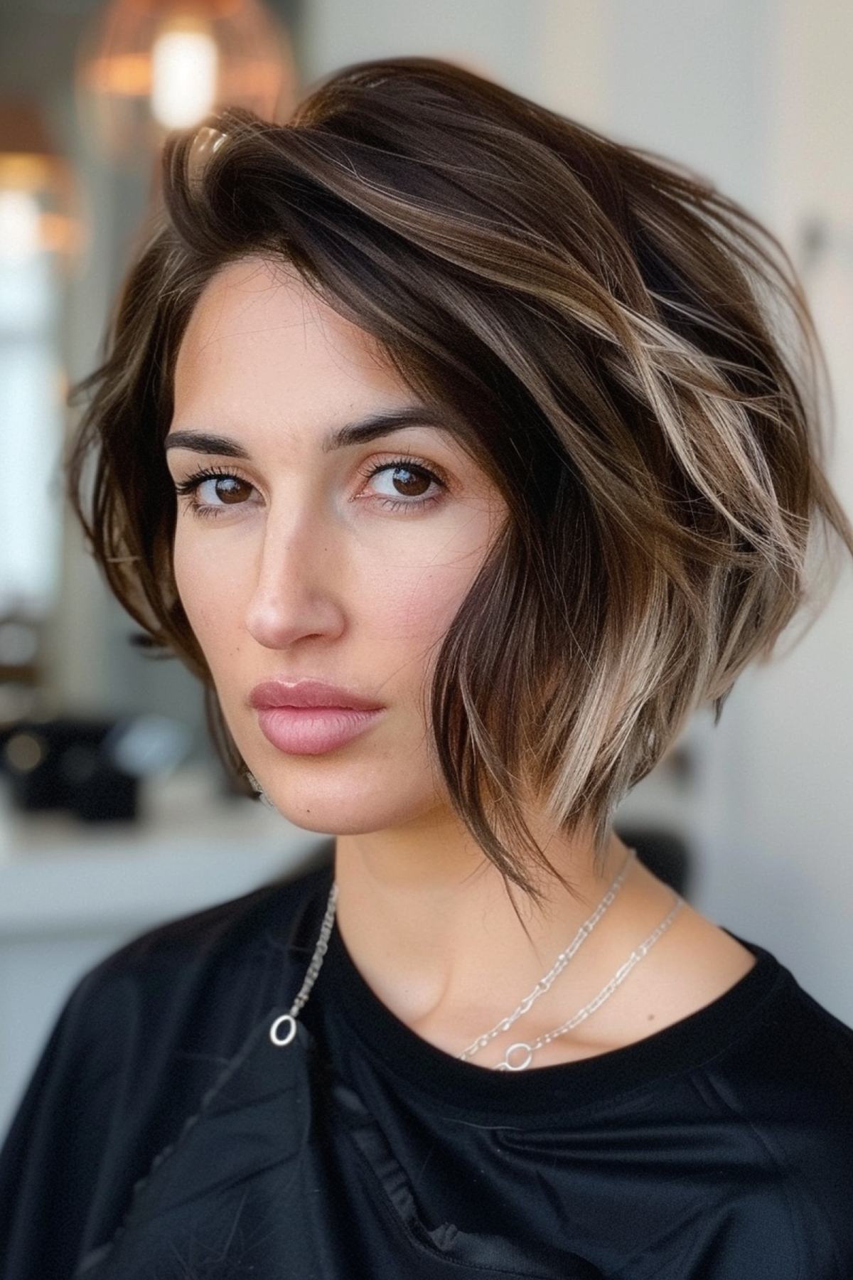 This textured waves balayage bob is a superb option for those with an oval face looking to enhance depth in medium-density hair. The asymmetry of the cut is complemented by the balayage’s warm tones, generating a sun-kissed effect that is both chic and manageable. Perfect for adding movement, the layers will help fine hair look fuller. Styling this cut may need a gentle approach with a curling wand to highlight the waves, and employing a color-safe shampoo will maintain the vibrancy of the balayage highlights. This cut is practical yet trendy, though the color will necessitate upkeep to remain vibrant.