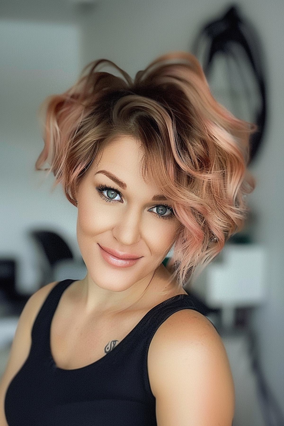 Step into spring with a stylish, charming rose gold wavy bob that’s all the rage this season! This cut, perfect for a round face, balances the width of the cheeks with volume on top. Ideal for those in their vibrant 30s, this style adds a youthful bounce to your step. The waves add body, making it a top pick for someone with medium to thick hair. However, waves like these do require some upkeep; you’ll need a good curl enhancer and maybe a wave spray to keep them looking spontaneous and crisp. The ombre color is clever, too – it stretches out salon visits since regrowth is less noticeable. For a seamless color gradation, chat with your stylist about balayage techniques, as it allows for a more natural rose gold fade. To protect the color, invest in a shampoo for colored hair and plan for occasional toning treatments.