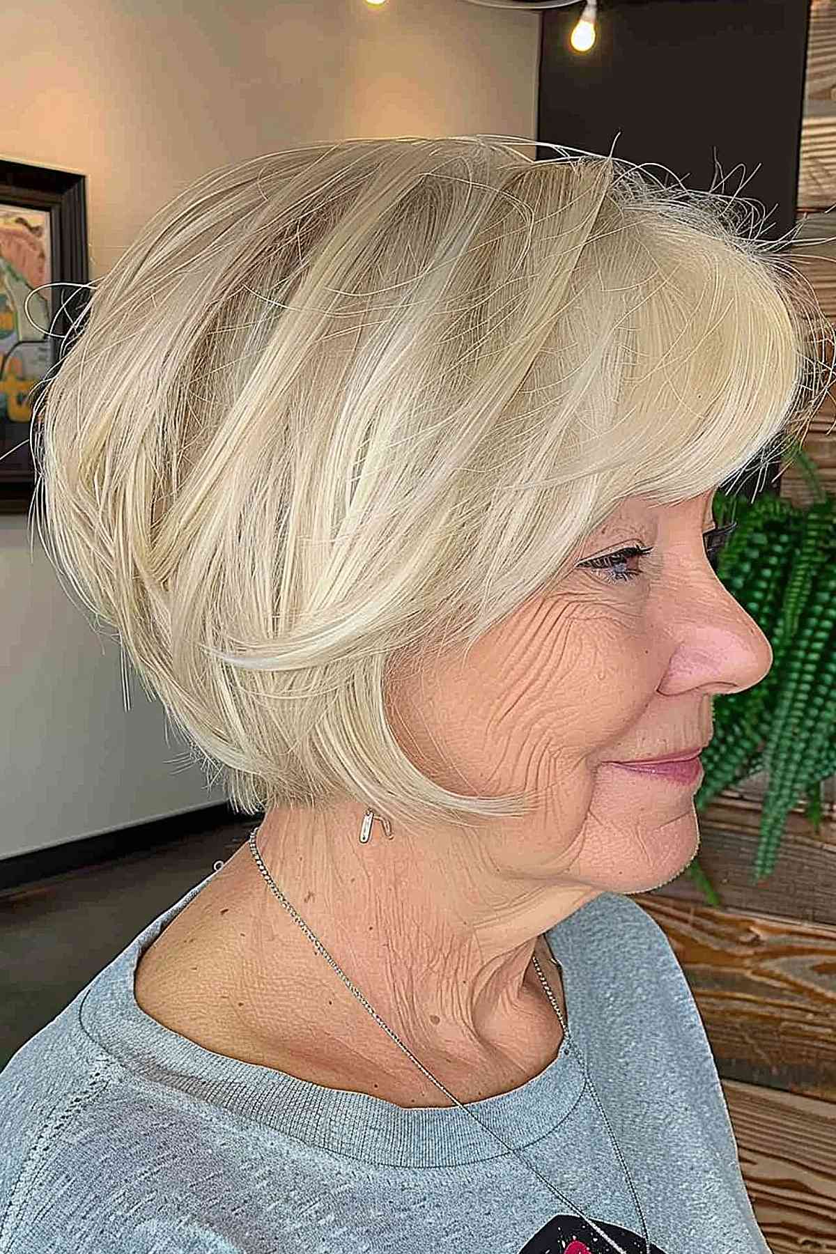 This bob hairstyle with asymmetry highlights a dynamic, tousled bob accentuated by a striking blonde money piece. This style is ideal for those with an oval face shape, enhancing prominent cheekbones. Discuss the incorporation of texturizing techniques to attain the desired lived-in texture with your hairstylist. To maintain its lively appearance, use a color-protecting shampoo, ensuring the blonde highlight stays luminous.