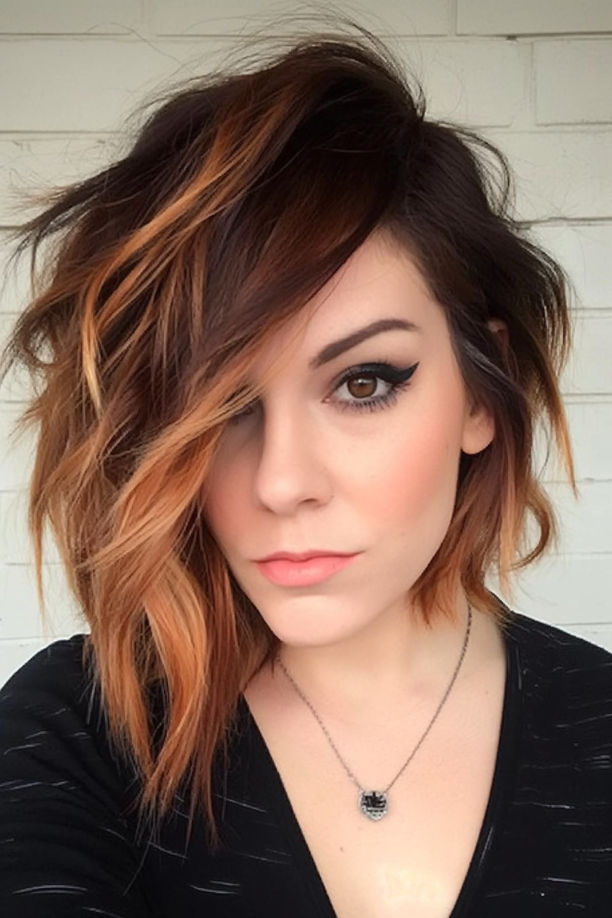 This stunning asymmetrical bob is enhanced with vibrant copper balayage highlights, creating a playful yet elegant vibe for your hairstyle. The waves contribute natural volume and texture, perfect for those aiming to complement a round or heart-shaped face. While this cut is fashionable and striking, it does require upkeep to maintain the color’s vibrance and the waves’ definition. I suggest using a curl-enhancing spray or mousse to elevate the texture, and a color-safe shampoo to preserve the copper hues. Consistent salon visits will be important to trim and refresh the color, ensuring your hair remains as dynamic as your spirit.