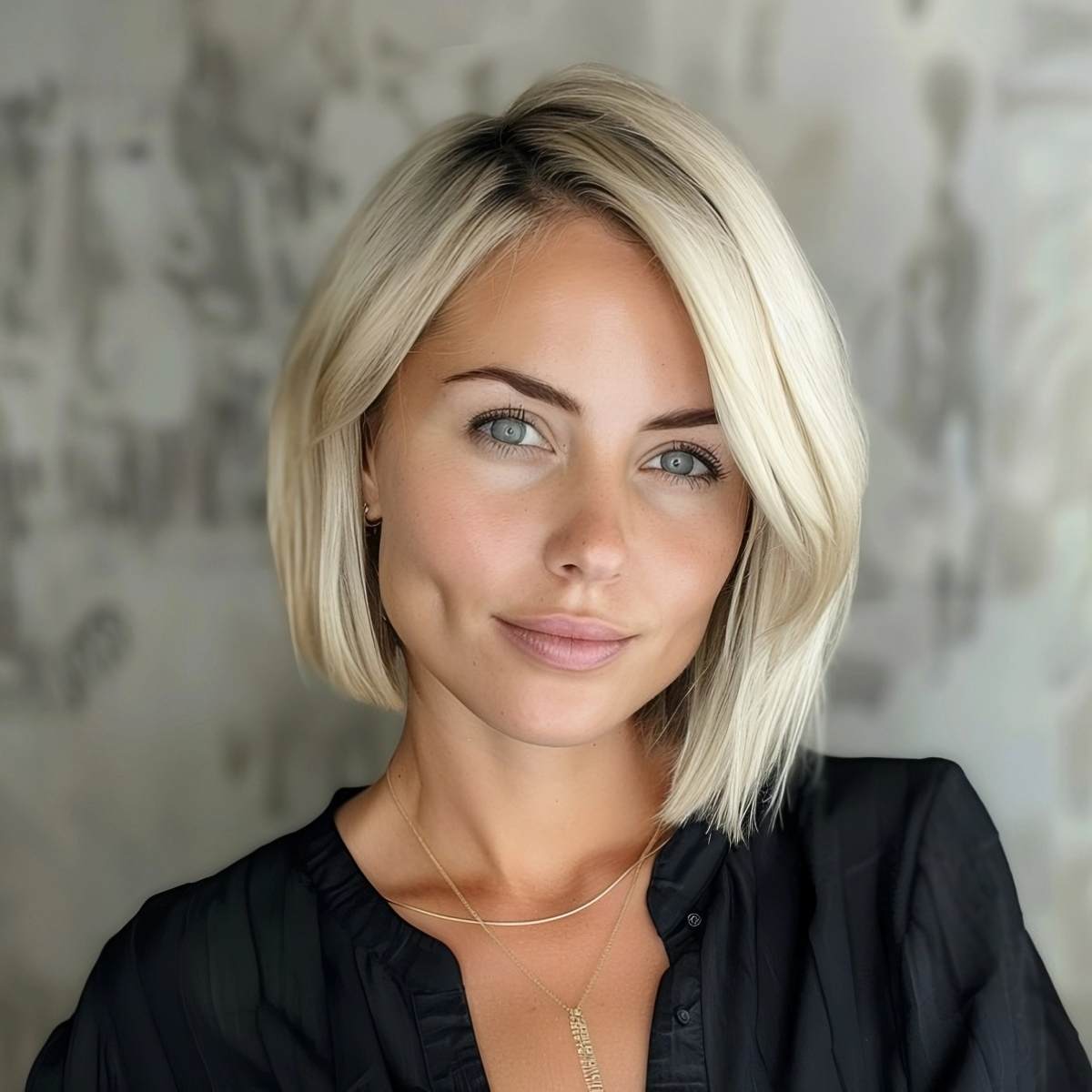 The stylish rooted blonde bob showcases a trendy gradient, merging darker roots with a shimmering blonde. This look particularly complements oval face shapes, highlighting natural contours. When discussing this cut, inquire with your stylist about blending techniques for a seamless root-to-tip transition. To enhance the effortless beach waves, use a sea salt spray on damp hair and scrunch for natural movement.