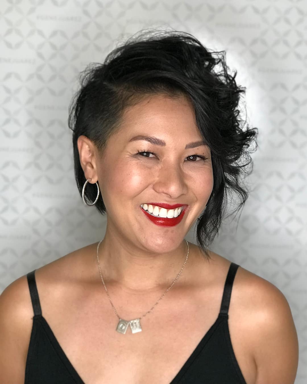 This stylish, asymmetrical pixie bob showcases a striking shaved side and playful wavy top layers. It is ideal for oval face shapes, enhances cheekbones, and introduces a youthful flair. When contemplating this cut, keep in mind that regular trims maintain the undercut sharp and well-defined. For styling, a texturizing spray can boost the waves and add a hint of modern chic.