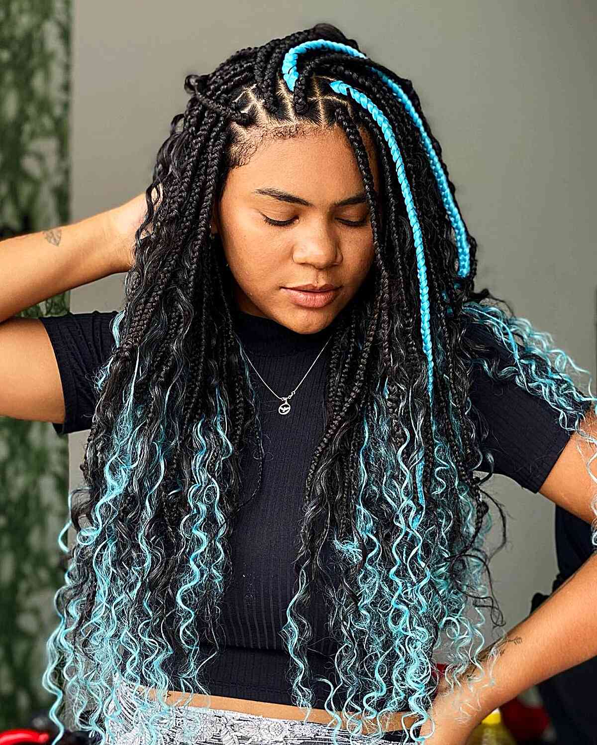 Looking to add some flair to your box braids? Consider rocking braids with teal accents for a vibrant and distinctive appearance. To elevate the style, ask for the ends of your braids to be loose and curled with human hair for a bohemian vibe. This style works best for black women who want to add some depth to their hair and stand out from the crowd. Remember to be mindful of the health of your natural hair. Take out your braids after 6 to 8 weeks to prevent any damage. Be sure to deep condition your hair before and after getting the braids. This will help to keep your strands healthy and resilient.