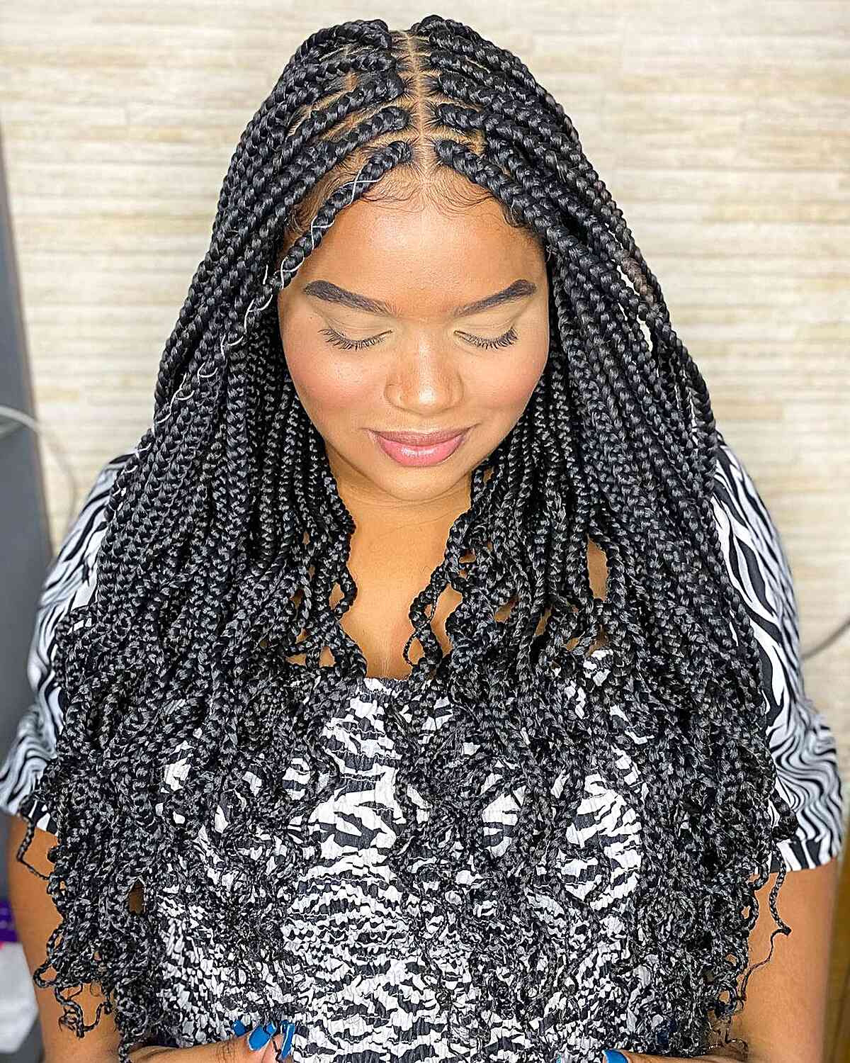 A trendy protective hairstyle favored by young black women is the Bohemian box braid look. They feature fluid, voluminous curls and dynamic movement. These box braids artfully blend loose curls with individual braids. I recommend using 100% human hair for the curls to ensure durability. Manage maintenance with products and heat as necessary.