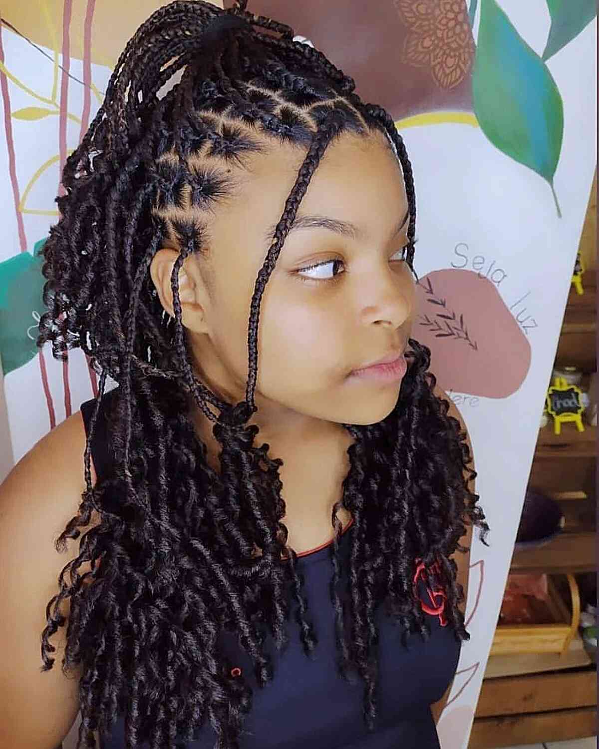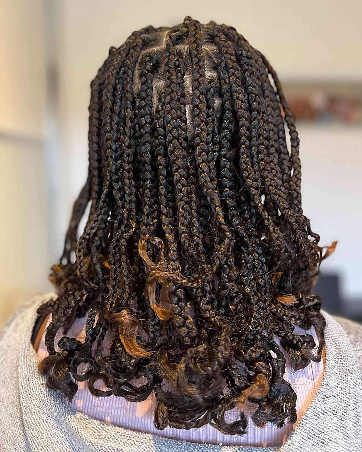 A trendy and adaptable protective style to sport at any time and for all ages are black box braids with curly tips. The braids are individual-like locks. They can be pulled up, down, and styled into many creative designs. One of the best features is the ability to manipulate the tips because of the type of braid hair used. For curly tips, you can braid the ends together and dip them in boiling water. If you want them straight again or change the curl pattern, re-dip them in hot water.