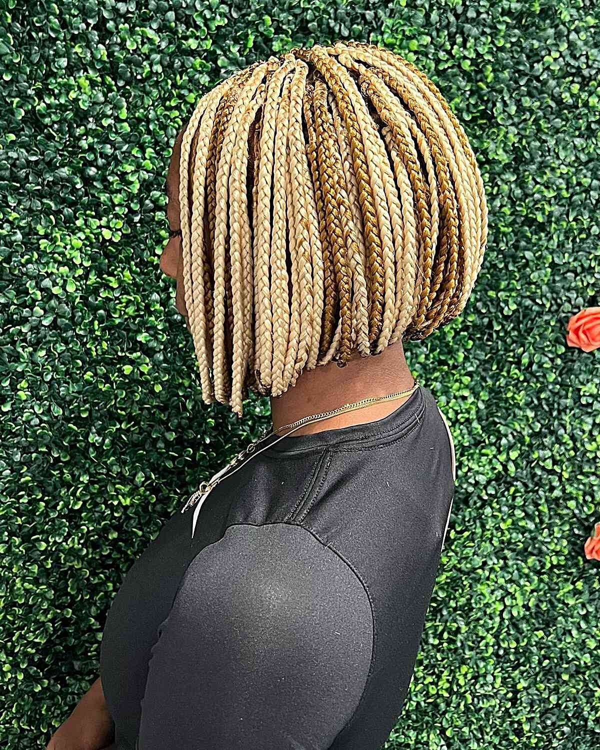 Explore the chic A-line bob box braids look. It offers a trendy style with minimal at-home upkeep. This option is ideal for women who are always on the move and prefer their hair neatly styled. Tailored for those with short hair, ideally no longer than about 4 inches. Despite the fact that the braids are shorter, there is still plenty of room for playful color combinations and hair accessories.