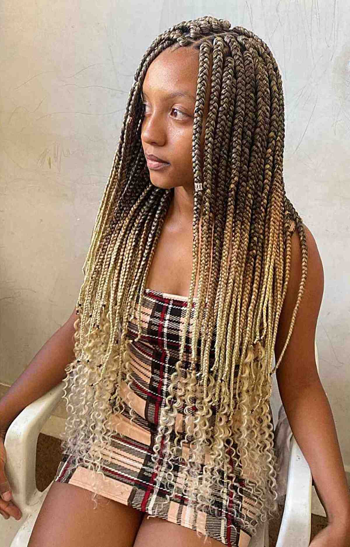 Explore golden long braids paired with a high bun for a chic look featuring knotless braids. Knotless styling offers a range of versatile options, allowing you to experiment with countless styles. Request your braider to tuck your natural hair during the installation process. Tucking will help maintain the style for a few months.