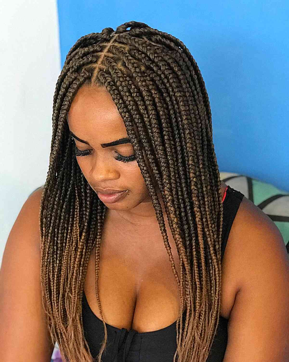 Mid-length box braids featuring an ombre shade are an excellent choice. They suit those who enjoy experimenting with different color combinations. To maintain the look of your braids, it’s essential to clean them carefully without excessive washing. Additionally, make sure they dry properly after getting wet.