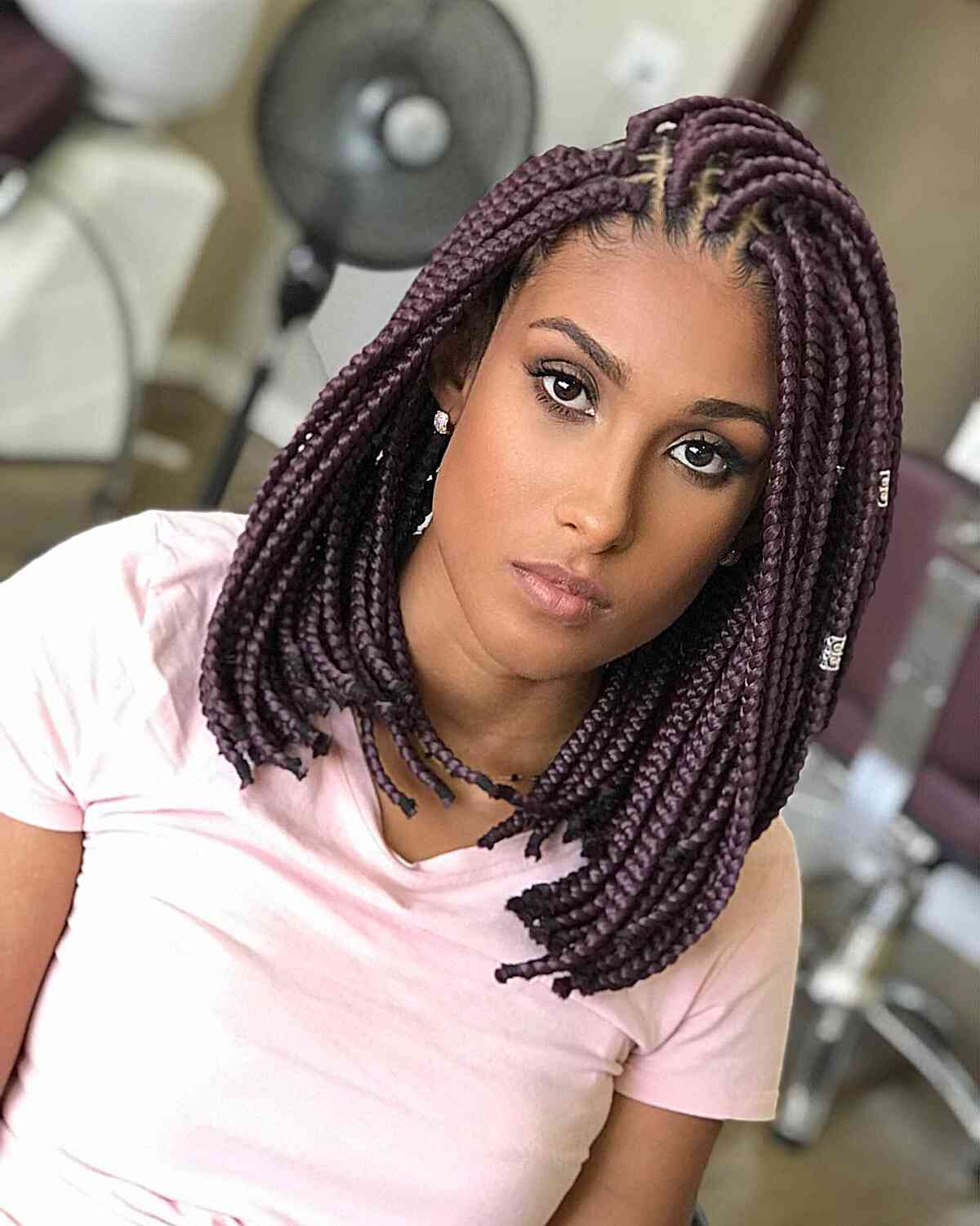 Have some fun with color and wear beautiful purple box braids. Box braid styles for women are notorious for being a simple “go-to” protective style. It’s because of their versatility and low maintenance. When the braids are installed, the key to getting color to pop is the tuck method. Ask for your natural hair to be tucked under the colored braid hair. That way, the color stands out and keeps your hair protected underneath.