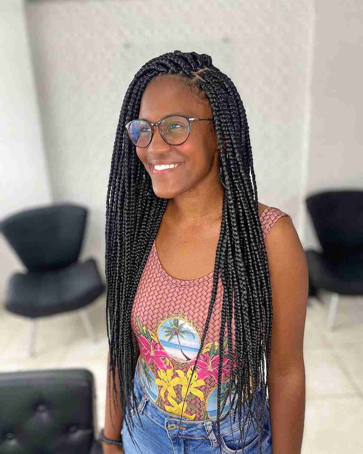 I’ve discovered that medium to large box braids serve as an excellent option for achieving a chic and enduring appearance. They offer flattering coverage while allowing you to express your style prominently. These braids can be the ideal choice when you’re looking for a protective hairstyle that endures for weeks. As a seasoned hairstylist, my advice is to utilize smaller sections of hair when crafting this look, as it will assist in achieving neatness and uniformity throughout.