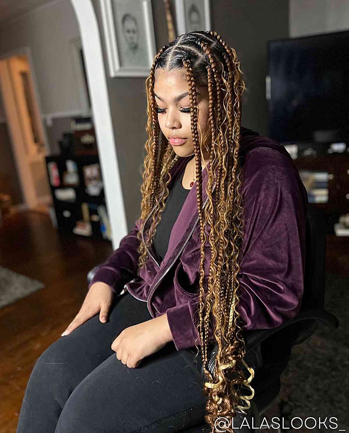 A simple yet stylish braid option is long bohemian knotless braids with color. Color combinations like 30, 27, and 613 will infuse warmth into your look due to their inviting tones. Request your braider to incorporate human hair waves throughout for added movement in your braid tresses. Keep in mind, human hair is the best choice for bohemian styles. This is because synthetic wavy hair cannot handle heat or styling products. As a result, achieving your desired look becomes difficult sooner rather than later.