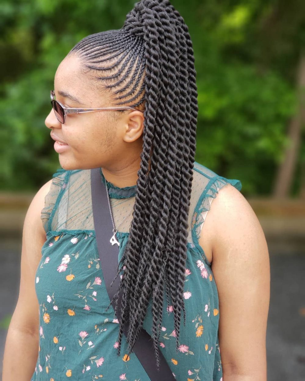 A stylish ponytail inspired by Beyonce, this hairdo begins with neatly crafted thin cornrows that twist slightly from the start for a more elegant touch.
