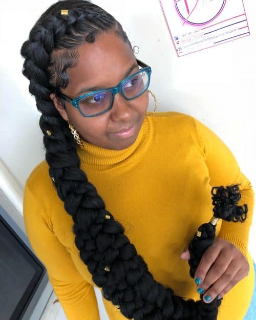 This sophisticated braided ponytail is sleek and striking, and because it’s a style inspired by rap queen Nicki Minaj, that vibrant energy naturally comes with the look. The precise parting at the top is such a complex design yet simple. The precision is the design, and that’s the best aspect of it.