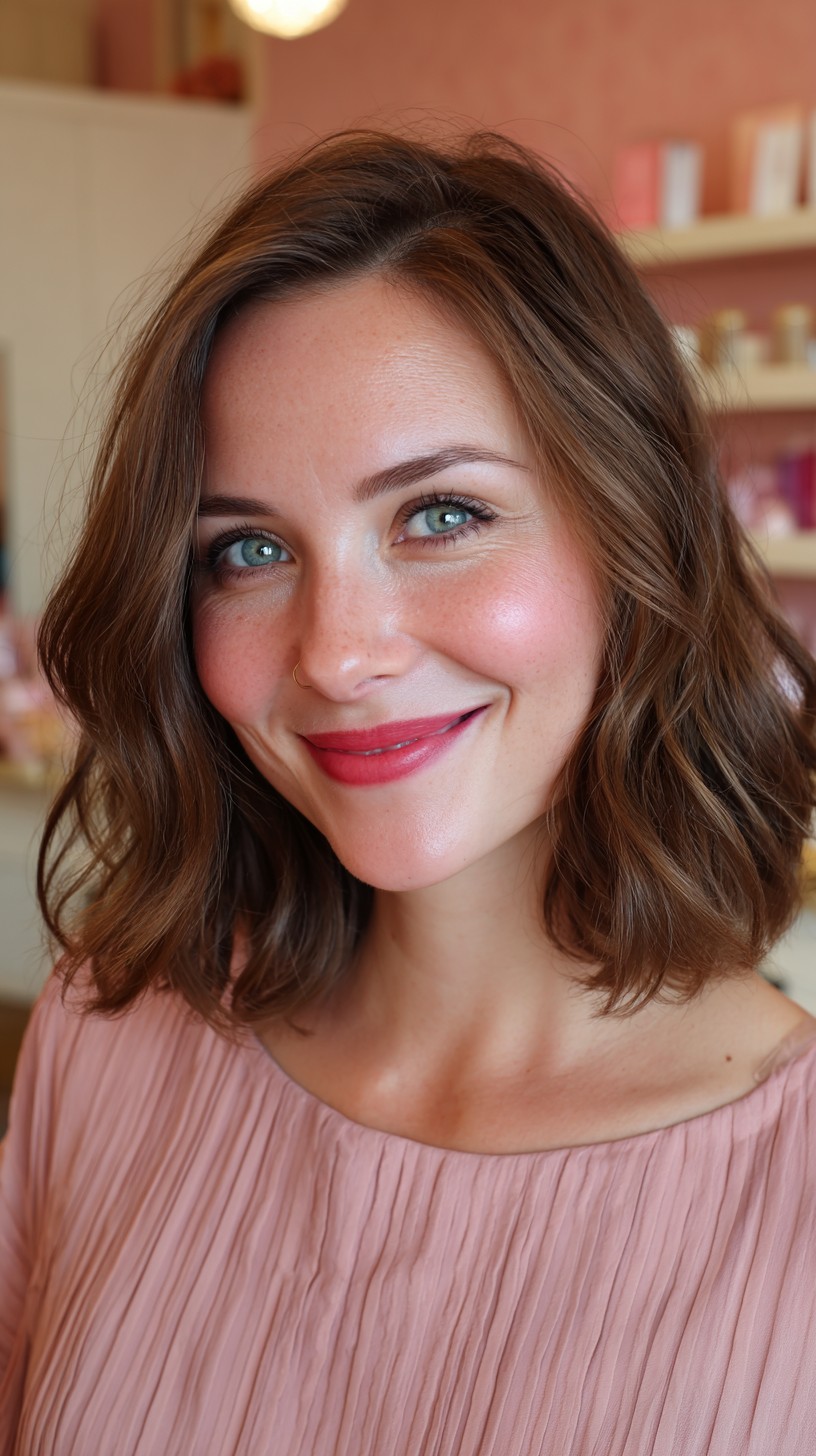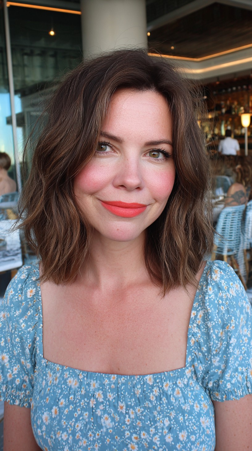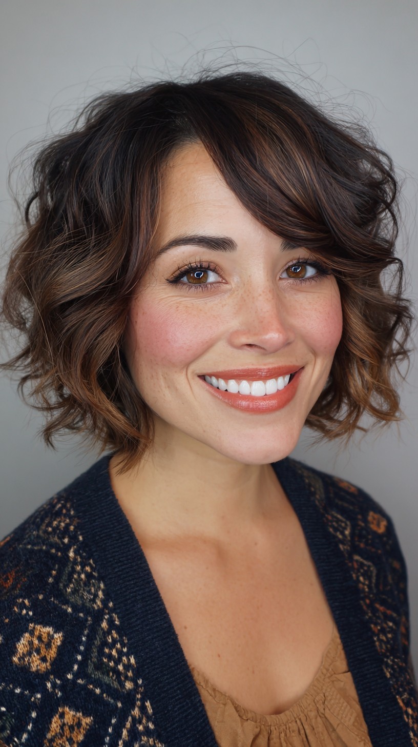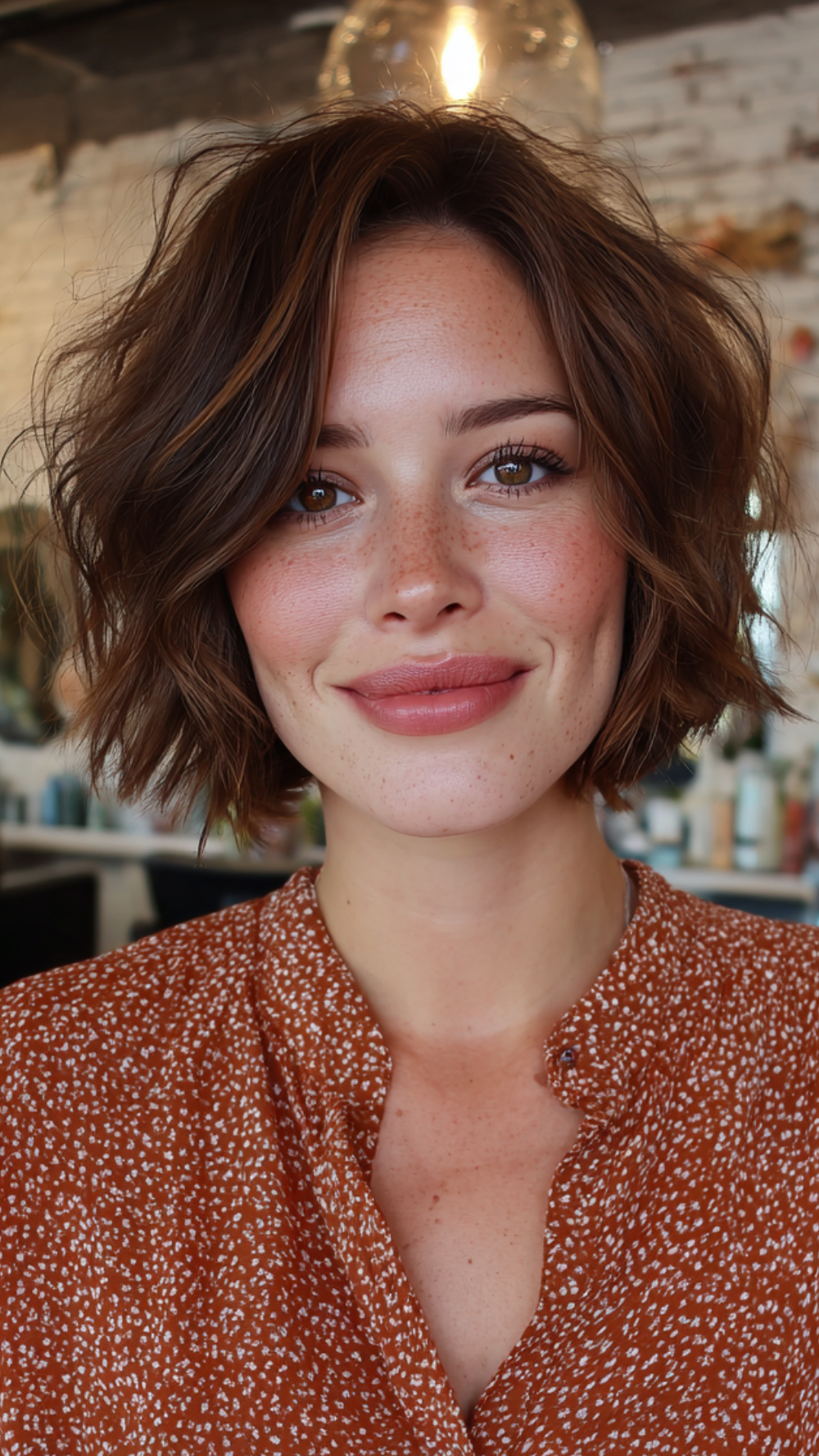This textured brown bob features soft waves that add a playful, easygoing charm. Perfect for oval and heart-shaped faces, the layered cut enhances volume, making it ideal for medium to thick hair. While the style brings out a fresh, youthful look, maintenance involves regular styling to keep waves defined and vibrant. A great choice for those willing to invest a little time each morning for a standout appearance.