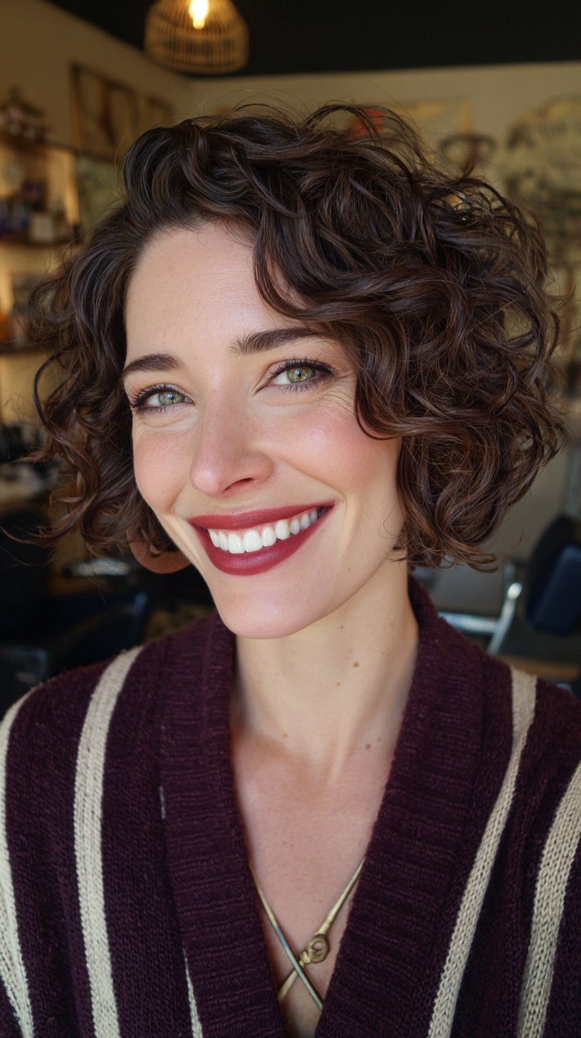 This curly bob is perfect for anyone craving volume and texture. The chestnut brown enhanced with subtle highlights builds a dynamic appearance that works wonders on naturally curly hair. The cut is layered to optimize bounce and minimize frizz. It’s an easy-length to maintain, albeit requiring regular moisturizing to keep the curls luscious. Ideal for oval or heart-shaped faces, this style adds softness and is age-adaptive, suiting both young adults and mature women. Enjoy a fresh and vivacious look without too much fuss.