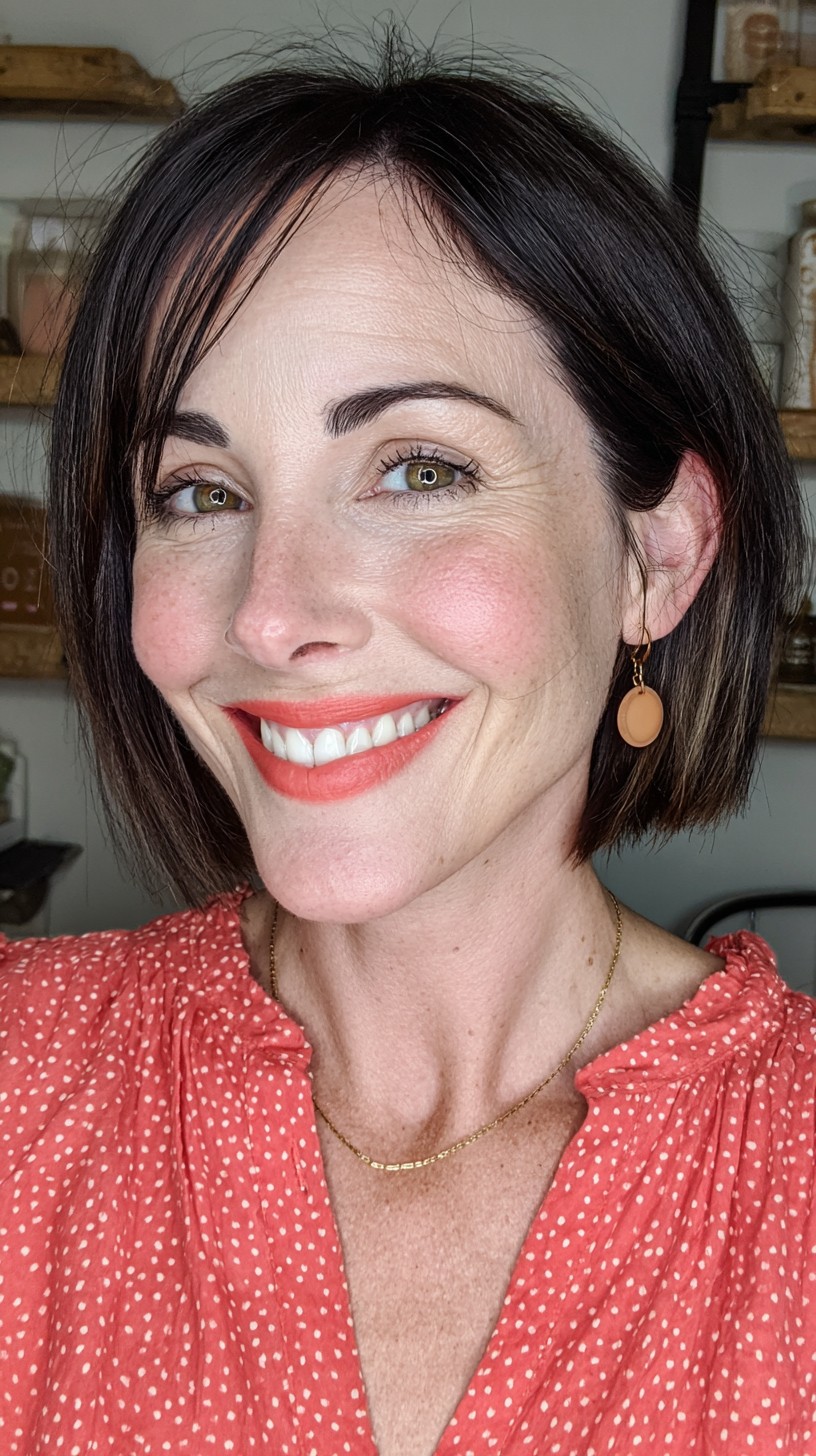 This shoulder-skimming blunt bob presents a crisp, modern edge that’s perfect for those looking to sharpen their look without dramatic change. Suitable for fine to medium hair, the blunt cut enhances thickness and provides a strong frame for softer facial features, balancing out round or heart-shaped faces particularly well. The uniform length offers low maintenance yet requires frequent trims to keep the neat line. Keep in mind, the precise cut might highlight split ends more prominently without regular care. This cut is straightforward yet versatile for styling changes.