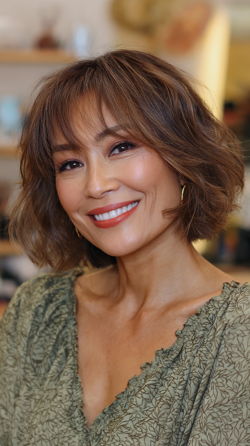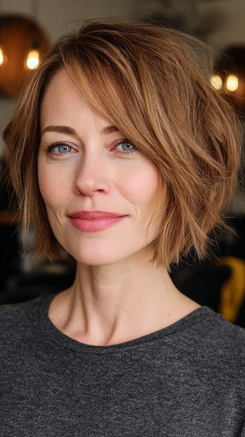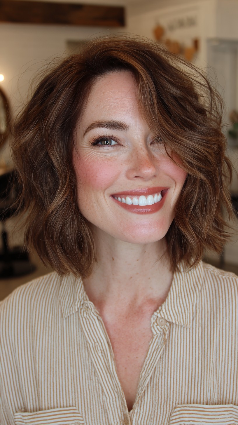 This tousled bob is perfect if you’re looking for a fresh, easy-care hairstyle. Cut to slightly below the chin, it adds volume, especially with those textured waves which are great for thin to medium hair types. The soft chestnut hue warms the complexion, looking fantastic on light to medium skin tones. While it’s versatile, keep in mind this style might require regular styling to maintain its textured look. It’s a lovely choice for anyone wanting a balance between sophistication and a laid-back style.
