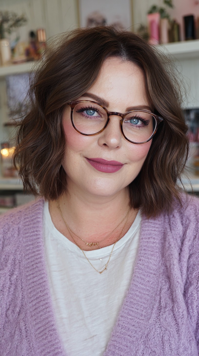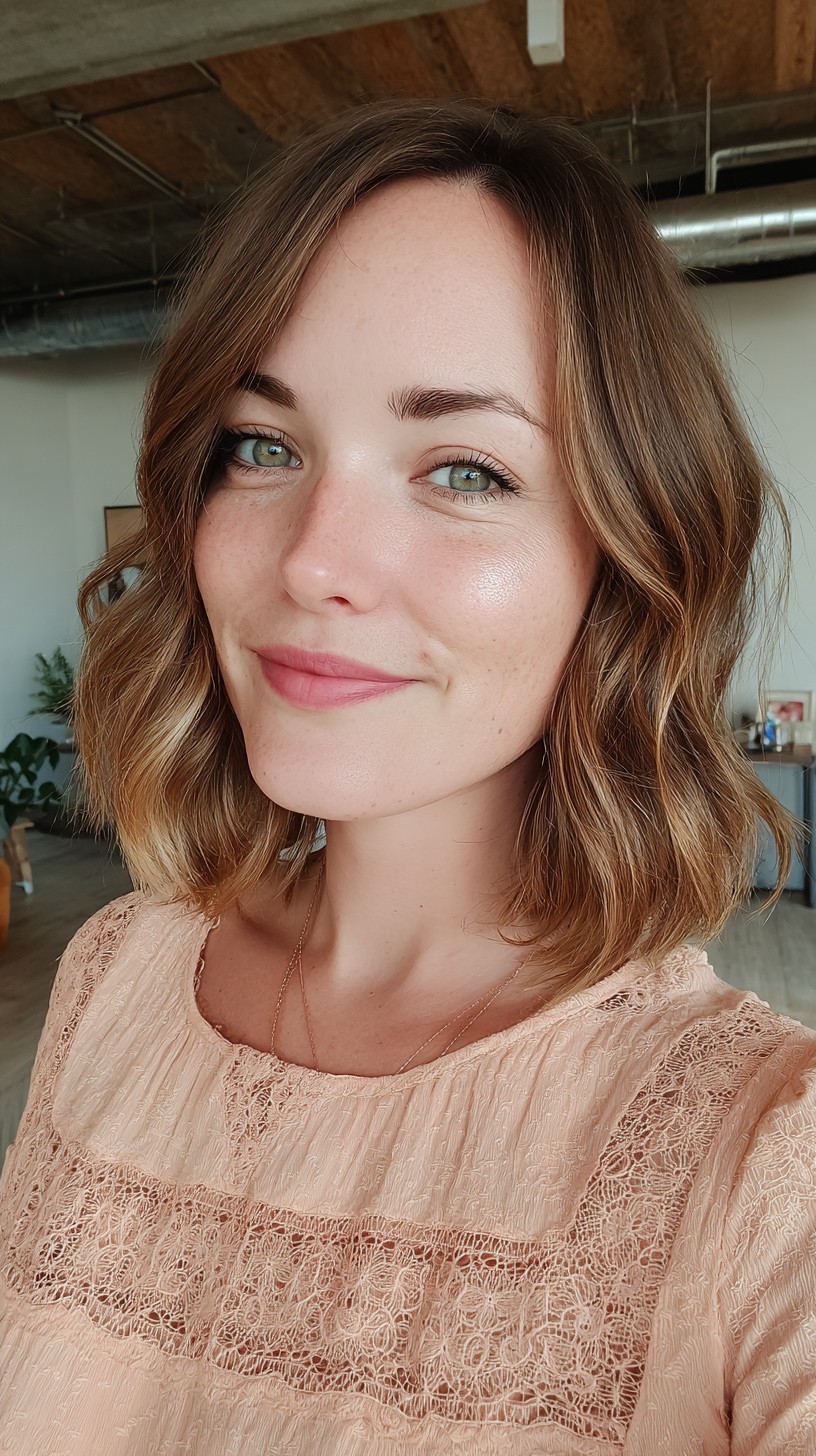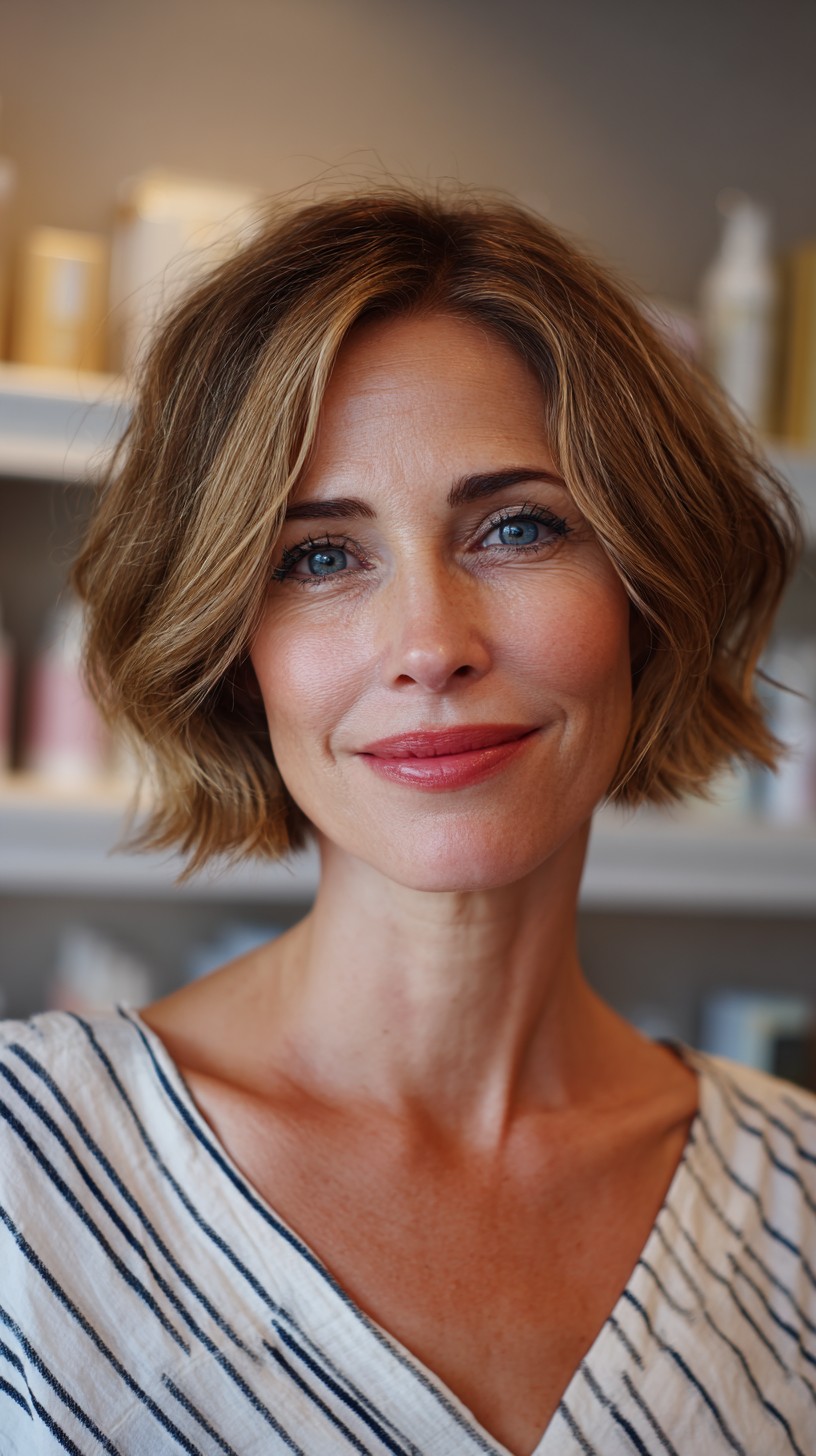 This tousled bob is perfect if you’re looking for a fresh, easy-care hairstyle. Cut to slightly below the chin, it adds volume, especially with those textured waves which are great for thin to medium hair types. The soft chestnut hue warms the complexion, looking fantastic on light to medium skin tones. While it’s versatile, keep in mind this style might require regular styling to maintain its textured look. It’s a lovely choice for anyone wanting a balance between sophistication and a laid-back style.